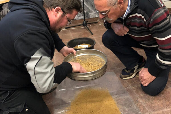Tijdens de nieuwjaarsborrel werd enthousiast gezeefd met de grondmonsters uit de bossen van Bergeijk, Riethoven en Westerhoven. Helaas was het zand wat nat, het zeven krijgt een vervolg op woensdagavond. Dit is onderdeel van het het promotieonderzoek van Jesper de Raad over non-destructieve archeologische technieken.