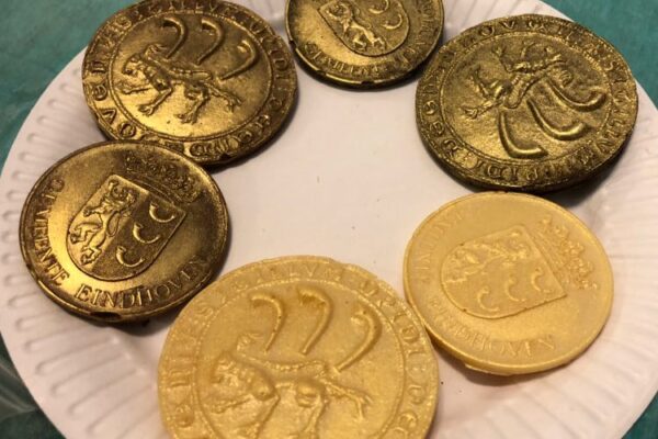 Tijdens de leuke opendag op 4 oktober, ter ere van 10 jarig bestaan van het Erfgoedhuis Eindhoven en Helmond heeft wethouder Maes van Lanschot mte de vinders de gerestaureerde muntschat van Eindhoven onthuld. De gestaureerde munte blinken je tegemoet. Daarna waren er diverse activiteiten en kregen alle bezoekers een unieke Eindhovense chocoladepenning.