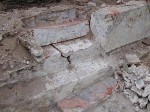 Ontgraven brandmuur, inmeten van muurwerk, onderzoek keldermuur, aspot naast haardplaats, onderzoek aan brandmuur.