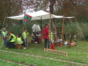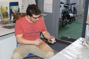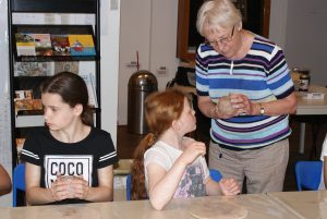 De eerste groep krijgt een demonstratie vuursteen bewerken, de tweede groep gaat naar buiten om te proberen vuur te maken met een vuurboog. De derde groep maakt prehistorische drinkbekers van klei, die op een later tijdstip worden gebakken in de oven.