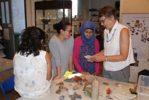 Na de pauze wordt de les voortgezet in de werkruimte met het determineren van allerlei soorten materiaal zoals: botten, diverse soorten aardewerk, metaal en sorteren gezeefd materiaal van grachtafval.