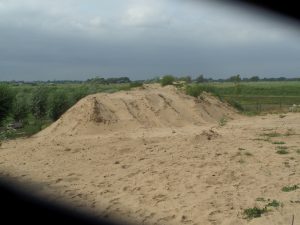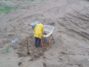 Achterop het terrein lag een enorme berg zand van ca. 200 m3, klaar om onderzocht te worden. Het is natuurlijk onmogelijk om zo’n grote hoeveelheid zand te zeven in de betrekkelijk korte tijd, die we tot onze beschikking hadden. Van tevoren hadden we een zeef gemaakt van 1x1m, bespannen met metaalgaas met een maaswijdte van 5mm. Na ongeveer een uur in de gestadig neervallende regen de ene schep zand na de andere te hebben gezeefd was het resultaat nog niet om blij van te worden.