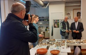 Wethouders Ed Goverde en Ton Spek van de gemeente Sliedrecht zijn donderdag op bezoek geweest in de werkruimte om de vondsten van de Baanhoek, Sliedrecht, te bekijken.
