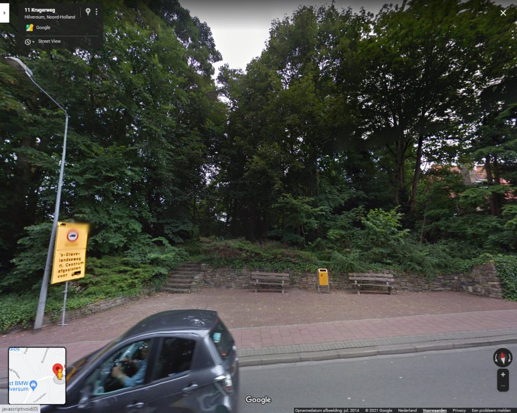 Op een hoogtekaart van de top van de Hoge Dreuvik zien wij linksonder aan de lijn tussen de erven dat de Trompenbergerweg vroeger helemaal doorliep naar de top. Bij het aanleggen van de Krugerweg is daarvoor veel grond weggehaald. Tja, deze gemeente heeft een lange traditie met heldenverering. Op deze Krugerweg doet zich tegenover nummer 11 iets merkwaardigs voor. Er loopt een trap nergens heen. Nog geen pad of iets. De trap komt uit op een vergeten stuk overwoekerd onverkaveld terrein.