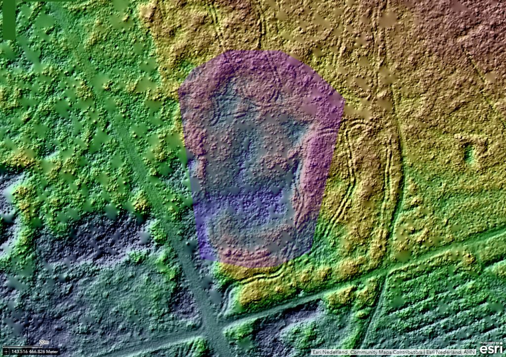 De oppervlakte van deze carré is te groot om aan een vergaderplaats te denken. Maar iets moet hier aan de hand zijn geweest, gezien het voorkomen op oude kaarten. Het zal de buurtbewoner niet opvallen als die hier voorbij gaat. Maar met de digitale hoogtekaart zijn die onopvallende lijnen op te halen.