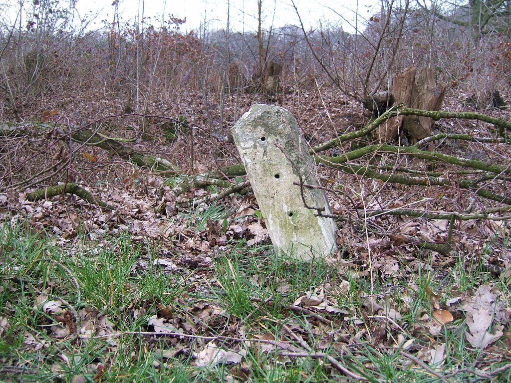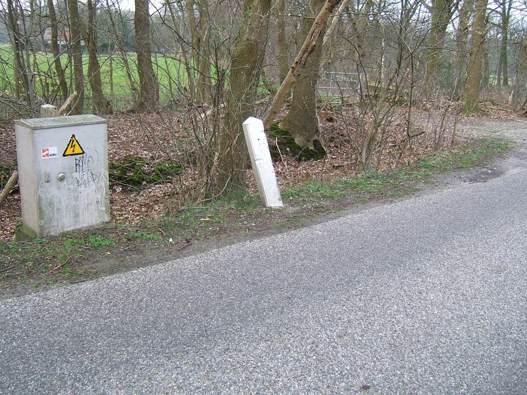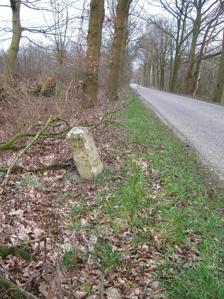 Even vóór wij de Raaweg bereiken zien we een aardig oud grenswalletje en een mooie stenen paal die ‘s-zomers onzichtbaar is door het struikgewas. In het algemeen kunnen we de palen veel beter vinden vóór dat de bladeren aan de bomen zijn.
