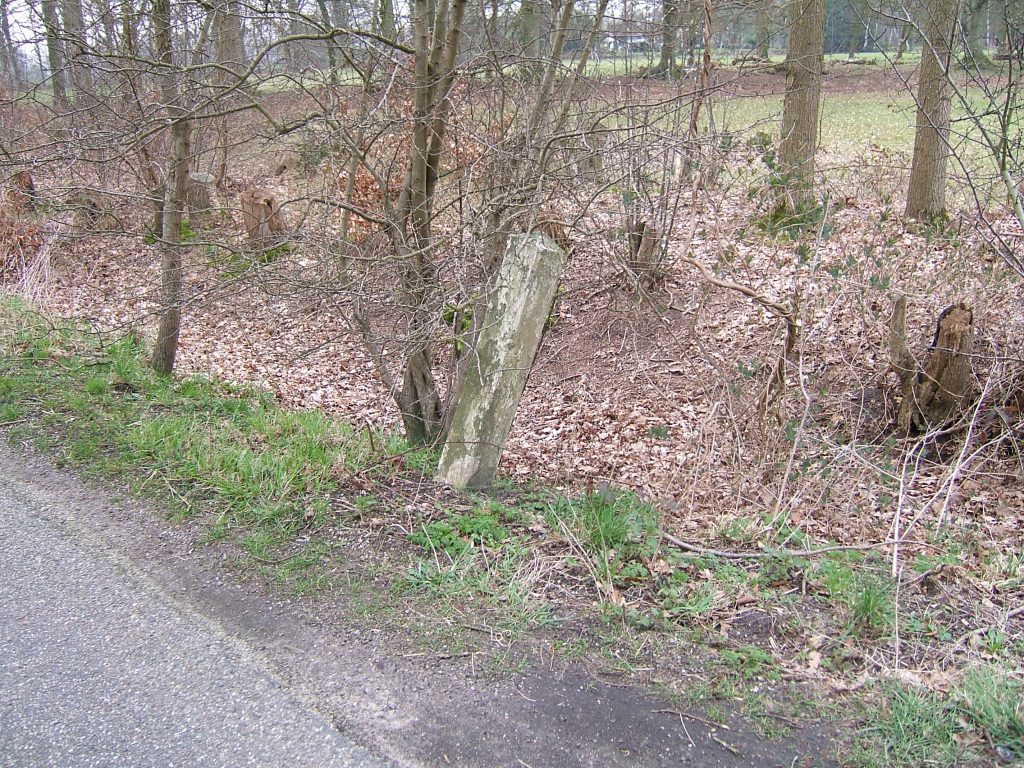 25 M ten Noorden van paal 3 zien we een korte stenen paal met merkwaardig wapenschild en uitgehakte cijfers. Het wapen lijkt wel dat van Gelderland! en het jaartal Anno A.M, IXX zegt ons niet veel, Zou bedoeld zijns het 19e regeringsjaar van Aartshertog Maximiliaan of Aartshertogin Margaretha van Parma?? Dan zou dit wel een heel merkwaardige vondst zijns de dag dat we hem deden vergeten we nooit!