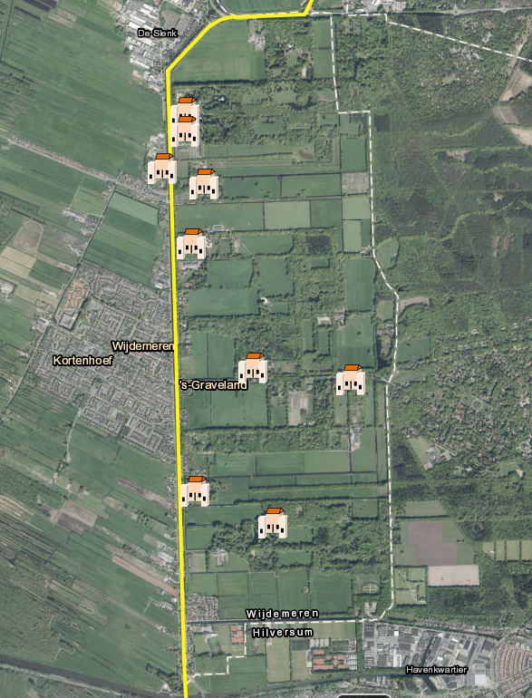Het betreft hier niet de huidige grens tussen Hilversum en ’s Graveland. Een strook land, ten noorden van de Leeuwenlaan Naarderveld, ten zuiden Trompenveld genoemd, is pas later bij ’s Graveland getrokken. In 1731 konden zij worden ontgonnen als gevolg van een herverdeling van markengronden onder de dorpen. Ze werden, alhoewel onderling verschillend, aanvankelijk extensief gebruikt, later afgezand en vervolgens bij enkele bestaande buitenplaatsen getrokken. Hierdoor kwam de grens langs Corverslaan te liggen.