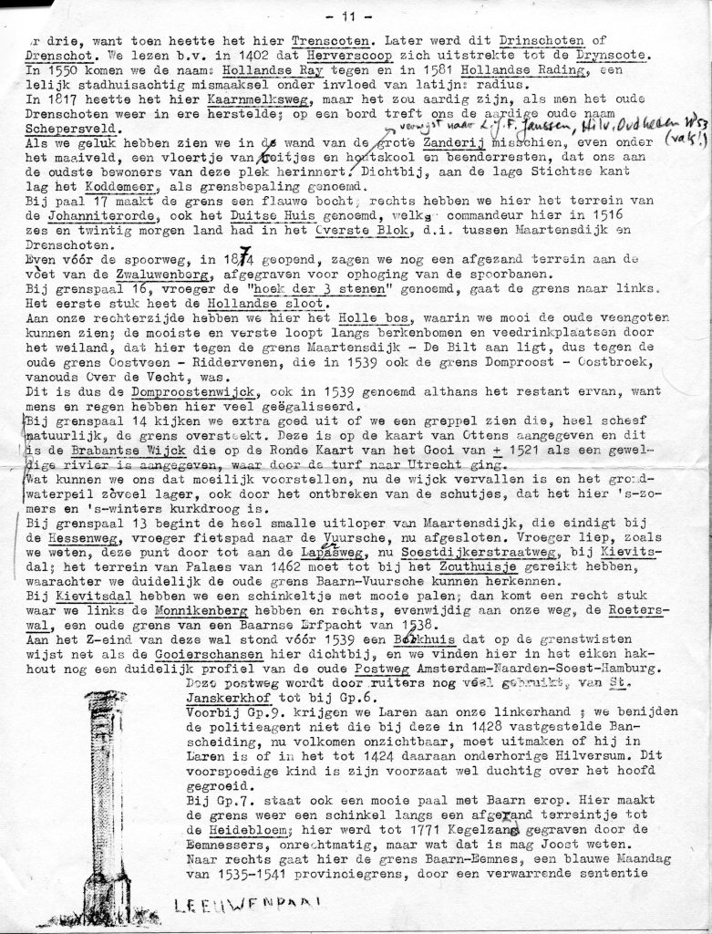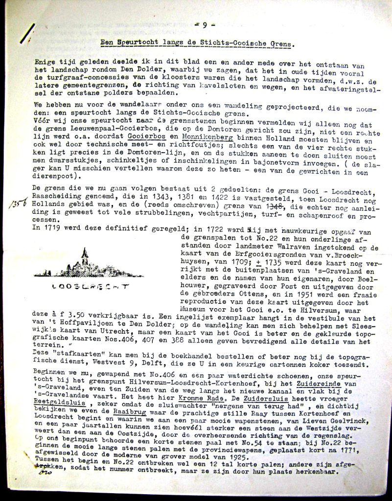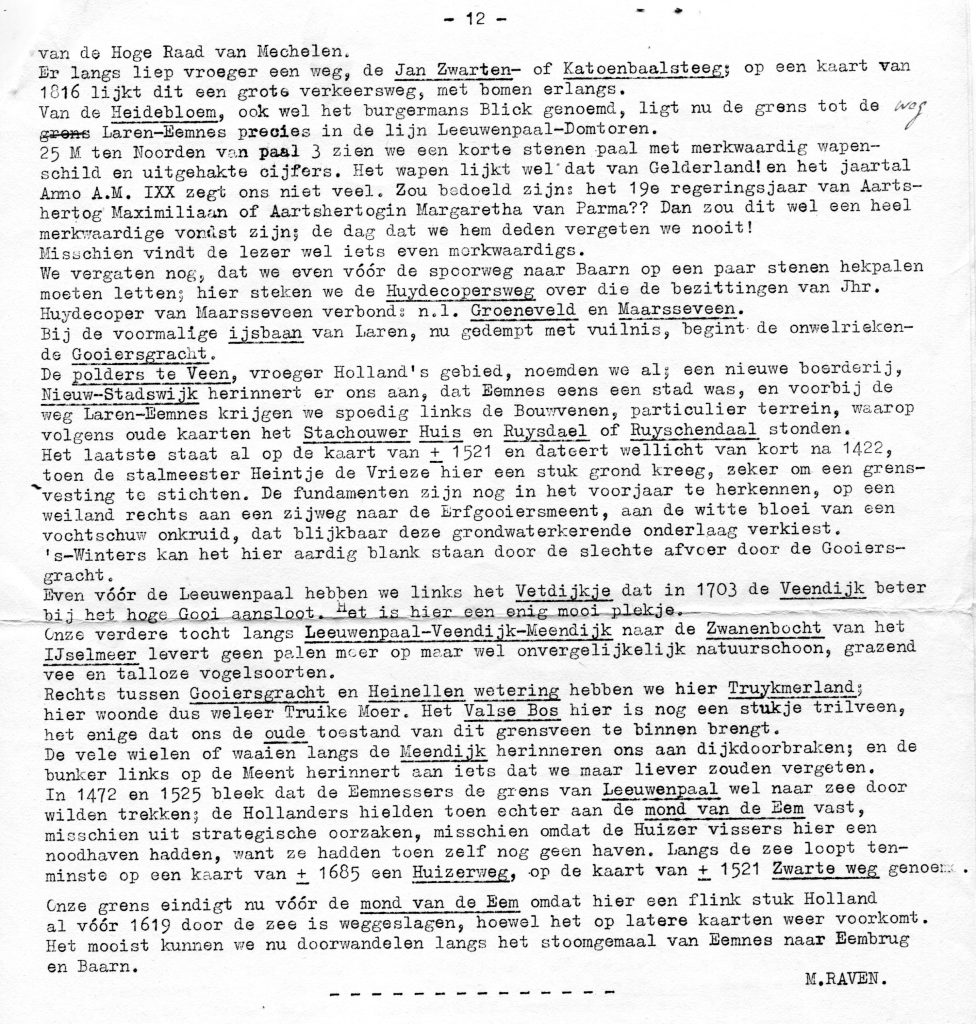 Begin jaren ’50 heeft Max Raven de volgende speurtocht in een nog niet achterhaald blad gepubliceerd. Wij kregen het met andere stukken uit het mapje met onder andere zijn kaart, als overdruk in handen. Eind jaren ’30 had Rodenburg in zijn “grenzen van het Gooi” reeds aandacht gegeven aan het onderwerp.