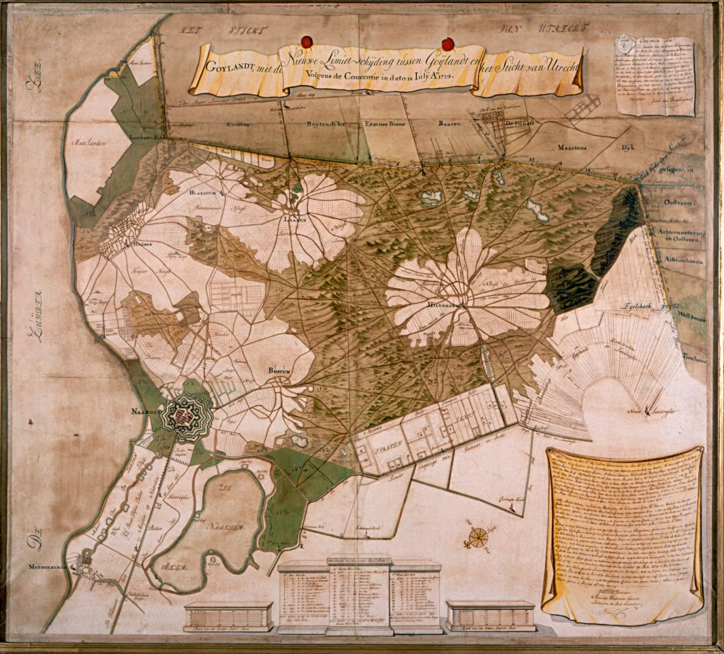 In 1719 werd deze definitief geregeld; in 1722 werd zij met nauwkeurige opgaaf van de grenspalen tot No. 22 en hun onderlinge afstanden door landmeter Walraven ingetekend op de kaart van de Erfgooiersgronden van v.Broeckhuysen, van 1709; ±1735 werd deze kaart nog verrijkt met de buitenplaatsen van ‘s-Graveland en elders en de namen van hun eigenaren, door Boelhouwer, gegraveerd door Post en uitgegeven door de gebroeders Ottens, en in 1951 werd een fraaie reproductie van deze kaart uitgegeven door het Museum voor het Gooi e.o. te Hilversum, waar deze a f 3.50 verkrijgbaar is. Een ingelijst exemplaar hangt in de vestibule van het van ’t Hoffpaviljoen te Den Dolder; op de wandeling kan men zich behelpen met Sleeswijk’s kaart van Utrecht, maar een kaart van het Gooi is beter en de gekleurde topografische kaarten Nos.406, 407 en 388 alleen geven bevredigend alle details van het terrein.