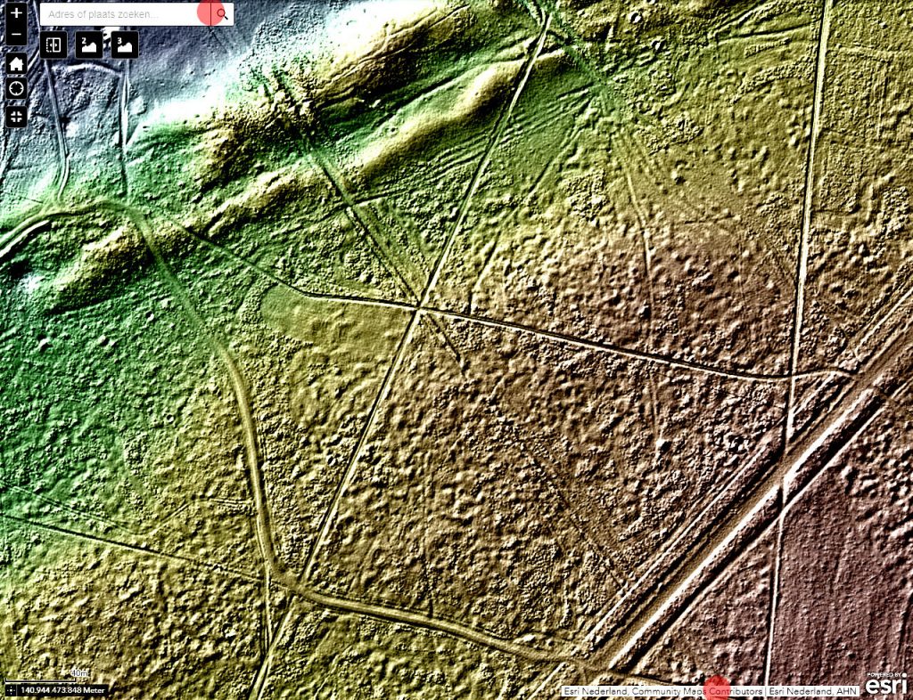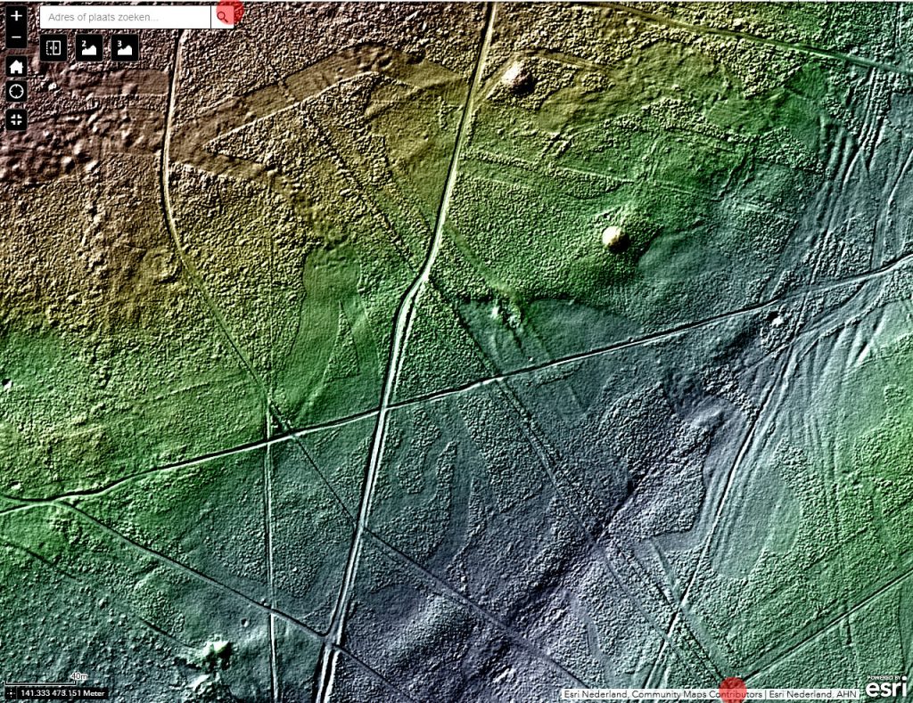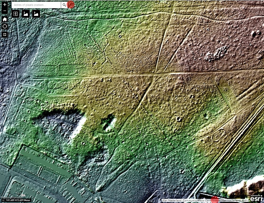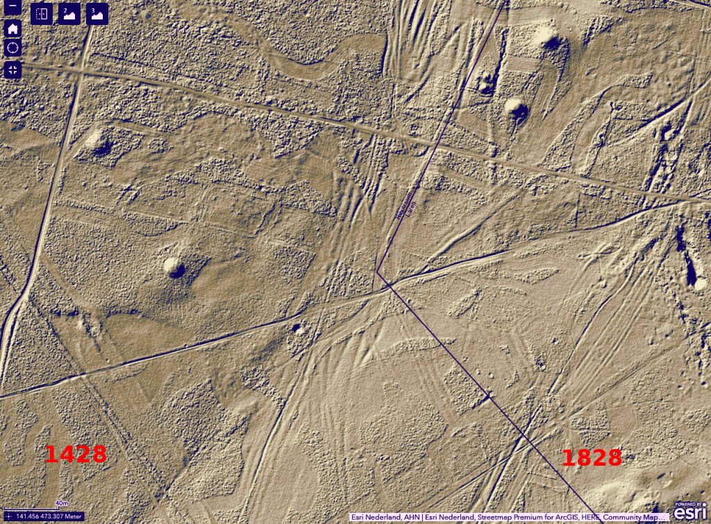 De latere grensomschrijvingen houden lijnen aan tussen bepaalde stenen of zijn daar tenminste naar op zoek. Van wallen is er echter in het grensverloop geen sprake meer. Voor of wellicht in 1732 moet de ban verlegd zijn. Maar meer dan een grenspad (óók erfgoed) zal de nieuwe scheiding niet behelsd hebben, met hier en daar een steen en enkele bomen op een vrijwel kale heide. Voor zover dit pad nog wel te traceren is in het veld, grotendeels is het relict inmiddels te gering om het op een standaard AHN hoogtekaart eruit te focussen. Probeer deze ook maar eens af te lopen. Vanaf de heide achter de Hilversumse straat Aardjesberg tot net over de wal van het voormalige militaire oefenterrein Crailo, zou u kunnen proberen. U kunt gewoon de grens volgen.