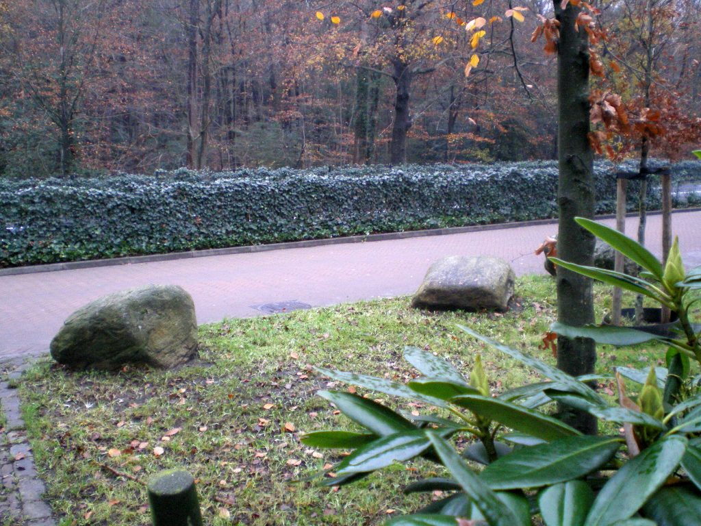 Ieder bezoek aan de banschieding echter zou moeten beginnen of eindigen op de Larenseweg. Want hier zijn ons enkele mooie en flinke banstenen overgebleven. Drie stuks zult u aan de Larenseweg voor Huize De Klingel vinden. (Nog een andere steen verderop, aan het begin van het fietspad naar rechts, achter de huizen, is ook nog historisch, alle tussenliggende stenen zijn recent en staan hier slechts voor de sier.) De meest noordelijke van deze drie banstenen lijkt iets te ver naar Laren te liggen. Kan verschoven zijn ten behoefte van een oprijlaan. Kan ook zijn dat een vierde aan de Hilversumse kant er ooit nog erbij hoorde. Voor zover we weten kunnen deze stenen over verschillende oude banen van de weg verspreid hebben gelegen. Wat met archeologische zekerheid vaststaat is de functie van deze steen hier. En dat deze Banstenen deel uitmaken van de Banscheiding. We moeten ze koesteren.