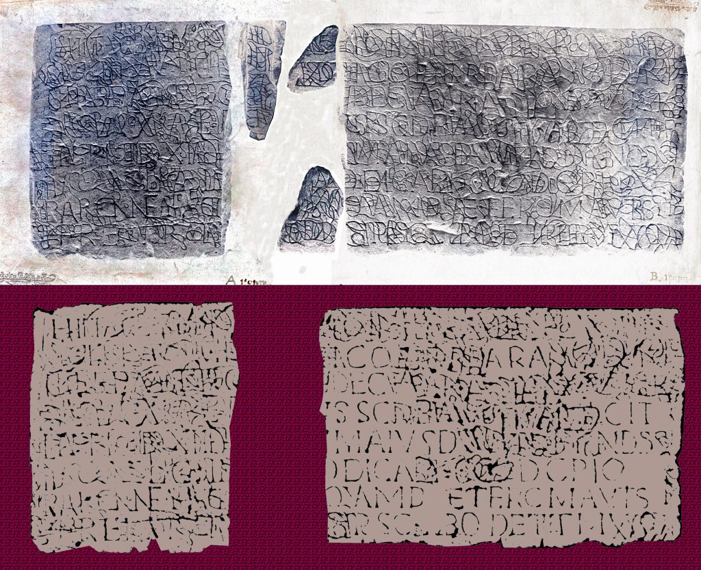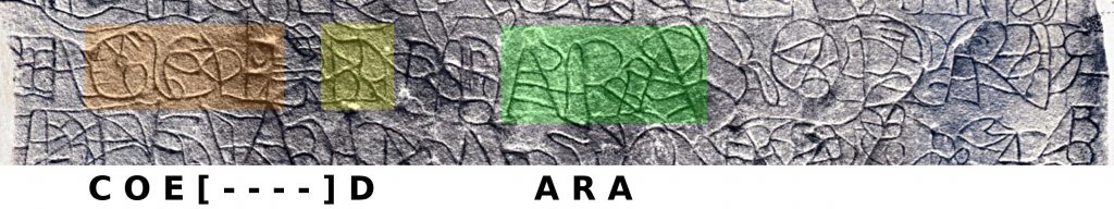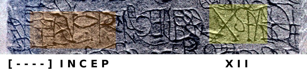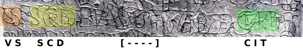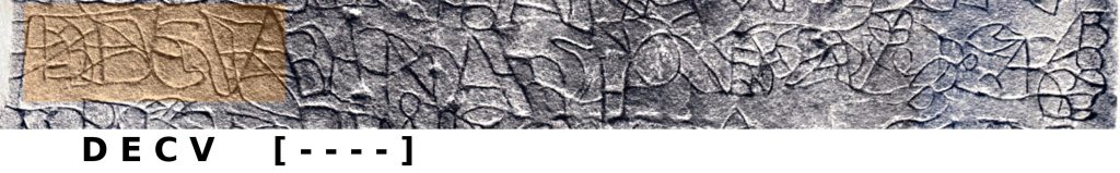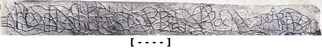 Tja, wat moet je zeggen erover. In elk geval zij opgemerkte dat die aanzienlijk gedeelte van de inscriptie is verloren gegaan (zo’n 30 procent), waarbij nog 20% van de letters te achterhalen is, impliceert dat bijna een derde van de steen dusdanig is bewerkt dat de oorspronkelijke schrift niet slechts versierd zijn met iets (geen schrift) maar dat hier tevens de oppervlakte zo bewerkt is, dat er niets van de oorspronkelijke tekst te zien kan zijn.