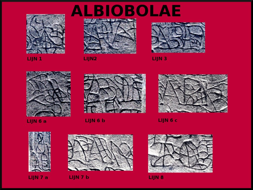 Uit de transcriptie, op basis van het letterbeeld van kapitalen, blijkt dat er geen sprake is van een vermelding van Albiobola; integendeel er lijkt zelfs sprake van het woord Tretm. Dit laatste is dan de vermelding van de plaats Utrecht in het toenmalige Latijn, en komt in historische bronnen omtrent deze plaats voor als Tre(c)ht.