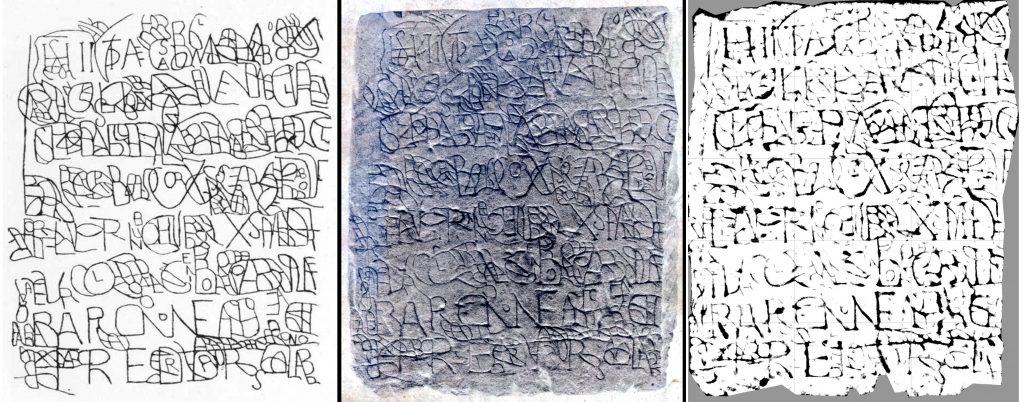 Zijn uiteindelijk gebruikte criteria blijven onvermeld. Van de hoogtekaart zelf krijgen wij alleen de eerste letter/monogram van het linker fragment en de niet toevallig geconstrueerd gedeelte van de laatste regel rechts, alleen in zwart/wit, een voorbeeld van filtering. “Dit nieuwe onderzoek tracht meer inzicht in de tekst te geven, en een voorzichtige indicatie voor de datering van de inscriptie te verschaffen.” Ook dit is politiek belangrijk. Een middeleeuws steen kan namelijk geen Romeinse inscripties bevatten, voorzichtig of niet.