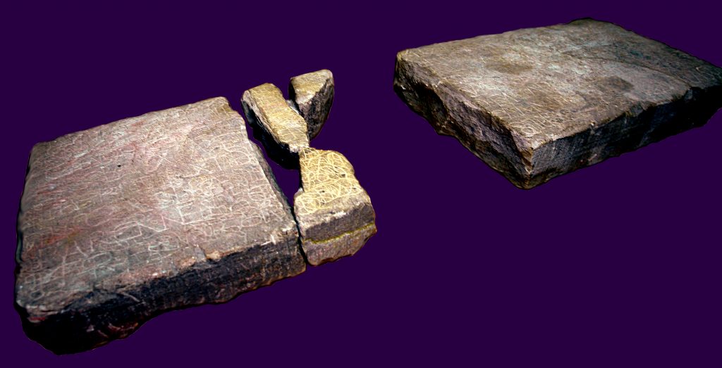 - Twee van de kleinere fragmenten zijn zijn twee aan elkaar “gelijmd met een soort cement”, welke zijn niet vermeld. Door wie onbekend.