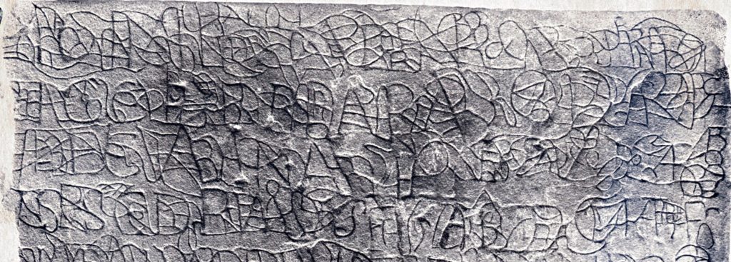 Hoe de letters van de bovenste drie regels geheel rechts op de steen zijn weergegeven getuigd van een eigen stijl, die slechts goed te vergelijken is met een moderne vorm van schrift uit de internationale volkscultuur, onze graffiti. Of je het mooi of lelijk vindt, kunstig of onbeschaafd, het valt niet te ontkennen dat A) het echte taal bevat en dus geen abstracte versiering is, B) de maker er aardigheid in heeft gehad op een originele, eigen wijze tekst weer te geven en C) dat er in enige mate sprake is van geheimschrift. Niet dat er grote geheimen achter hoeven schuilgaan. Maar wel dat ze niet per se bedoeld zijn onmiddellijk door iedereen begrepen te worden. Allen die het weten, kunnen het begrijpen, voor buitenstaanders is het niet evident. Jozef Janssen vermeldt in zijn boek Hiërogliefen (blz. 110) dat een stukje Egyptische geheimschrift na veel moeite zijn boodschap liet onthullen. Het las “schrifttekens heb ik gemaakt volgens mijn eigen idee en eigenhandig, zonder hen gevonden te hebben in de geschriften der voorvaderen”. Waarvan akte.