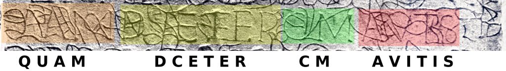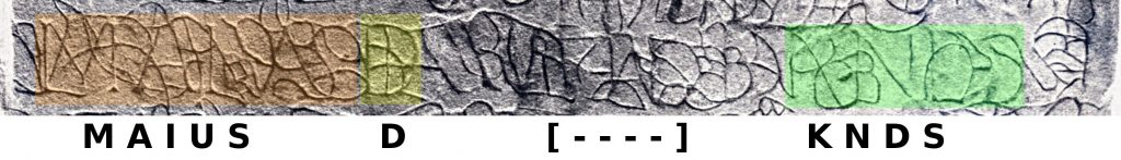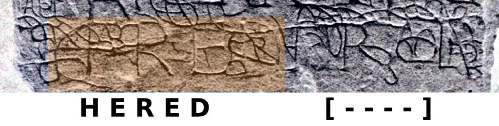 Maar wat blijkt als we inderdaad goed opletten? Er lijken wel wat verschillen te zitten tussen de gefilterde hoogtekaart en de foto’s van dat stukje. De tweede ‘E‘ lijkt overigens als kapitaal zwak. Op de foto loopt zijn been gewoon recht. Op de gefilterde hoogtekaart doet hij dit niet. Mogelijk heeft Vollgraff hier de lijn zelf opportunistisch door getrokken? Ook zweeft de letter boven de basislijn. Er lijkt aan de tweede ‘T‘ wel duidelijk een samengetrokken letter te zitten, duidelijker dan bij de eerste, die essentieel voor zijn lezing is. Mogelijk een ‘F‘, een ‘H‘ of waarschijnlijker een ‘E‘. De ‘M‘ lijkt een eind verderop los te staan. Waarom als die bij het afgekorte woord behoort? Deze letter lijkt ook nog een samengetrokken letter te bevatten. Gaarne hadden wij gezien hoe rechts van de ‘M‘ de hoogtekaart, gefilterd of niet, verdergaat. Moed begint hier bijna zo onnavolgbaar als Vollgraff te worden.