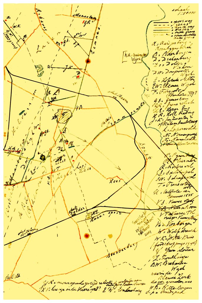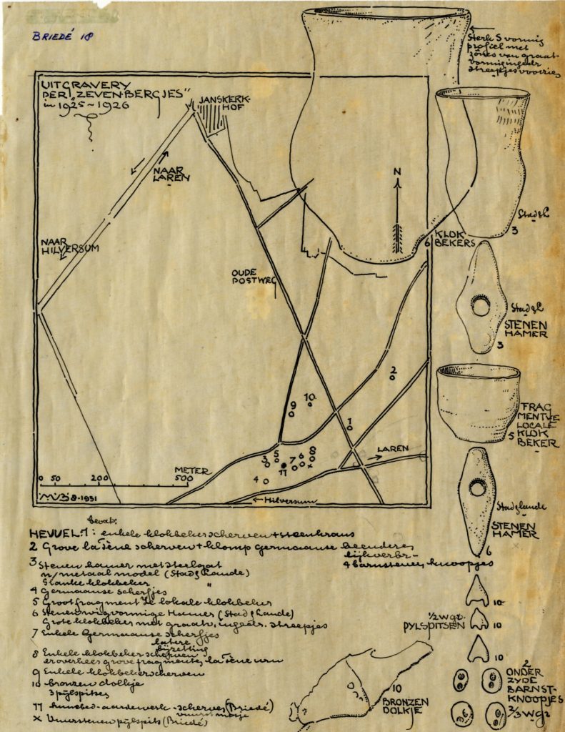 Het dossier waar kaart en aantekeningen deel vanuit maken is afkomstig uit de bibliotheek van Dr. Jan Albert Bakker. De toen nog aankomend student Bakker onderhoudt met de bekende illustrator en schilder tekenaar, Johan Briedé een correspondentie. Deze heeft zichzelf als oudheidkundige geschoold. Bij de grote archeologische onderzoekingen van de Zeven Bergjes en de boerderij op de Lange Heul, waar Briedé Rust in 1938 met het onderzoek geholpen heeft. Zijn tekenkunde is zowel cultureel als wetenschappelijk een juweel voor ons.