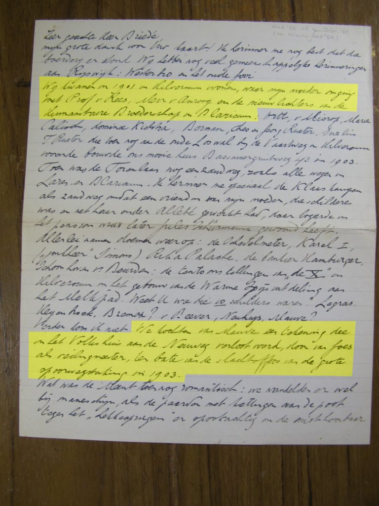 Met nieuwjaar 1959 schrijft hij “Wij kwamen in 1901 in Hilversum wonen, waar mijn moeder omging met Prof v Rees, Mevr v Anrooij en de nieuw lichters van de Humanitaire Broederschap in Blaricum.”