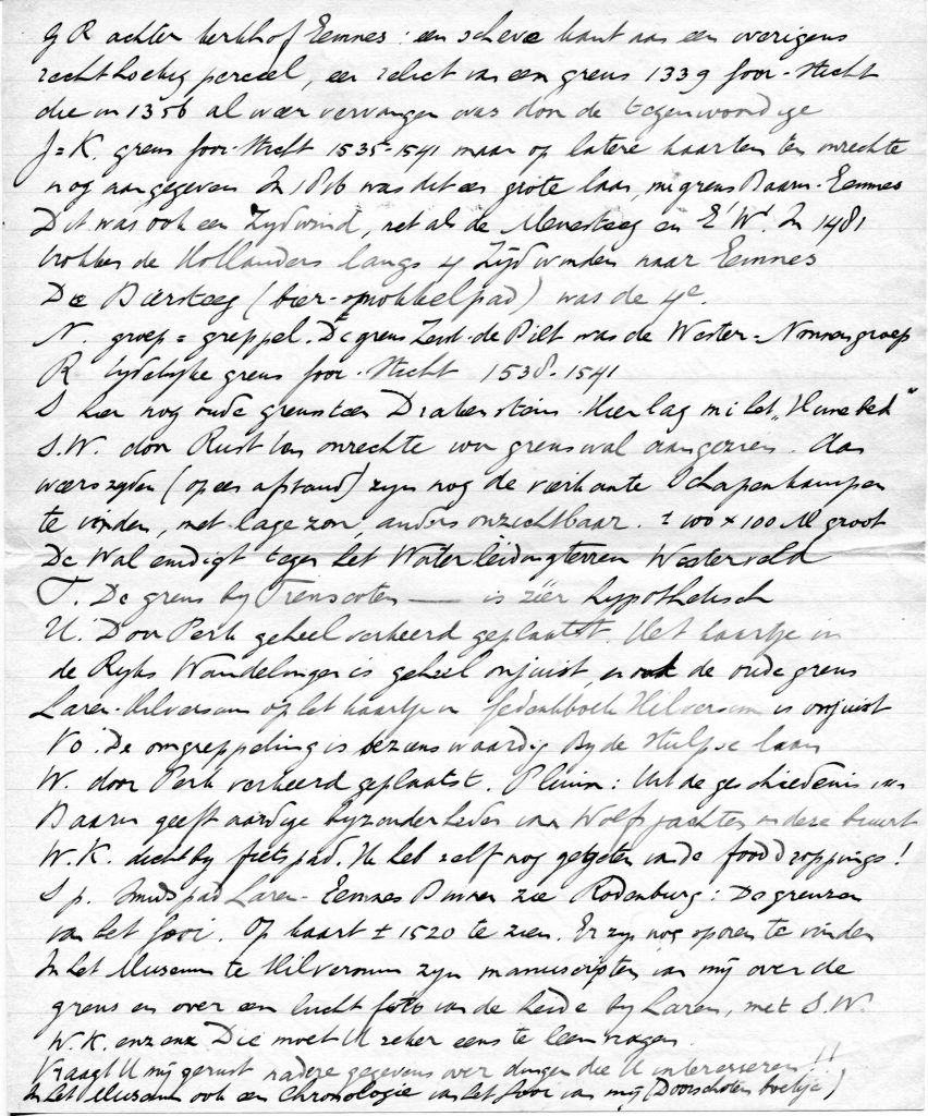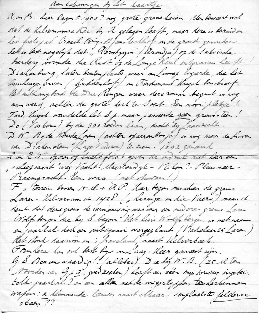 De grens Laren-Hilversum uit 1428 moet hier wel gelopen hebben, immers staat er “die husinge die nu in die Wuers betymmert staen”. Op de Vuursche vinden wij daar niets van terug, ook een door hem gevonden merkwaardig smalle terrein met de juiste oriëntatie, 750m van de hoogste punt van de Hoge Vuursche Weg niet.