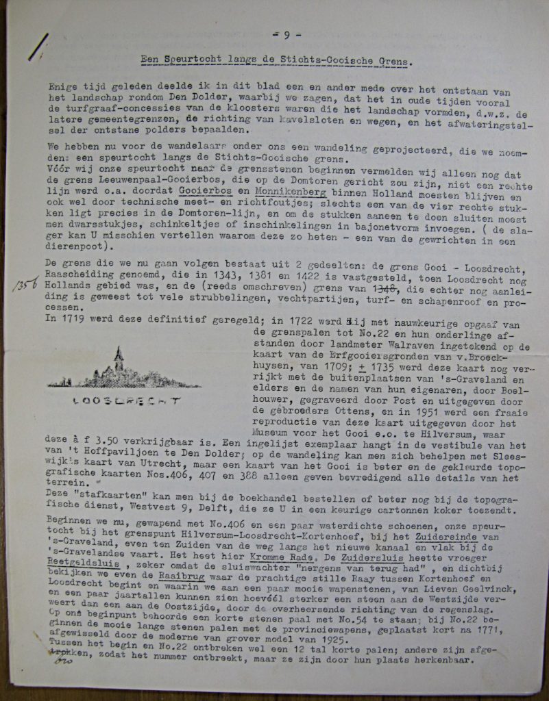 Zijn stukken uit het maandblad laat hij nadrukken op mooi zwaar papier. Ook heeft hij op een gegeven moment een Speurtocht langs de Stichts-Gooische Grensbedacht gemaakt. Gezien, dat het begint op pagina 9, is het ergens in gepubliceerd. Als u weet waarin, houden wij ons van harte aanbevolen erover geïnformeerd te worden.