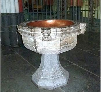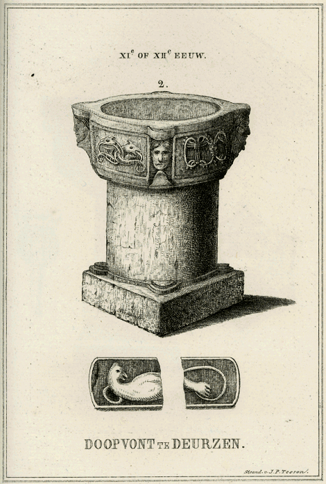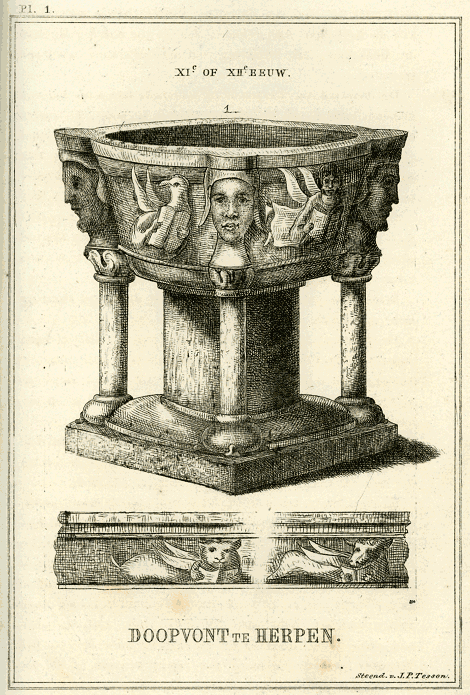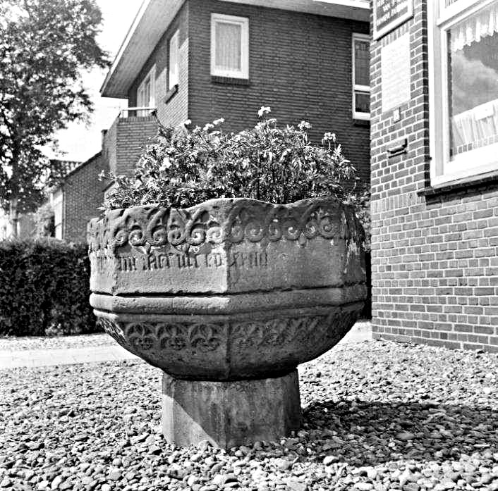 Precies zo’n type vont is ook in Epe, Gelderland weggeraakt. We vernemen hierover: “Het hardstenen doopvont, dat vrijwel gaaf is gebleven dateert uit de tweede helft van de 15e eeuw. Het deksel ontbreekt. Rondom de rand van het doopvont zijn de afbeeldingen – waarschijnlijk – van de vier Evangelisten: Mattheus, Marcus, Lucas en Johannes geplaatst. Het vermoeden bestaat dat de Gerfkamer van de kerk vroeger de doopkapel is geweest, waar het doopvont stond. Na de reformatie werd het doopvont niet meer gebruikt en is jarenlang zoek geweest, totdat het in 1893 werd gevonden in het aflezershuisje. Het diende – ondersteboven – voor de aflezers als verhoging. Dit aflezershuisje was een afdak aan de noordzijde van het koor, tussen twee steunberen, waar zondags na de dienst allerlei bekendmakingen werden “afgelezen” zoals: huwelijksaankondigingen, verkopingen, verpachtingen of bekendmakingen van de overheid. Men noemde het “bij kerkesprake bekend maken”. Na wat omzwervingen werd het doopvont in 1962 op het koor geplaatst om weer te worden gebruikt waarvoor het destijds is gemaakt.”