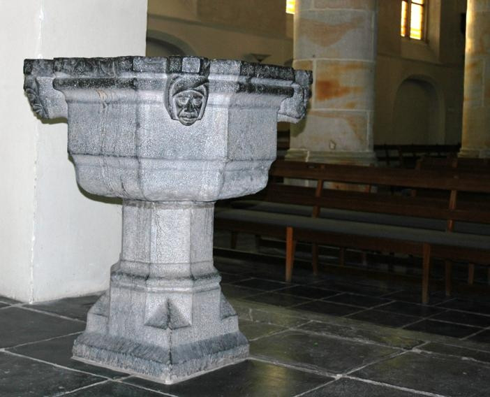 Tegenwoordig duiden we ze als een vrij algemeen verspreidde type, gemaakt tussen de 13de en 15de eeuw. Het Baarnse doopvont is gemaakt van Namense hardsteen (België) en vertoont vier koppen op de hoeken van de achtkantige kuip. Die koppen zijn, volgens liefhebbers niet zo verschillend en minder expressief dan die op vergelijkbare exemplaren uit de zelfde tijd, maar toch wel interessant.