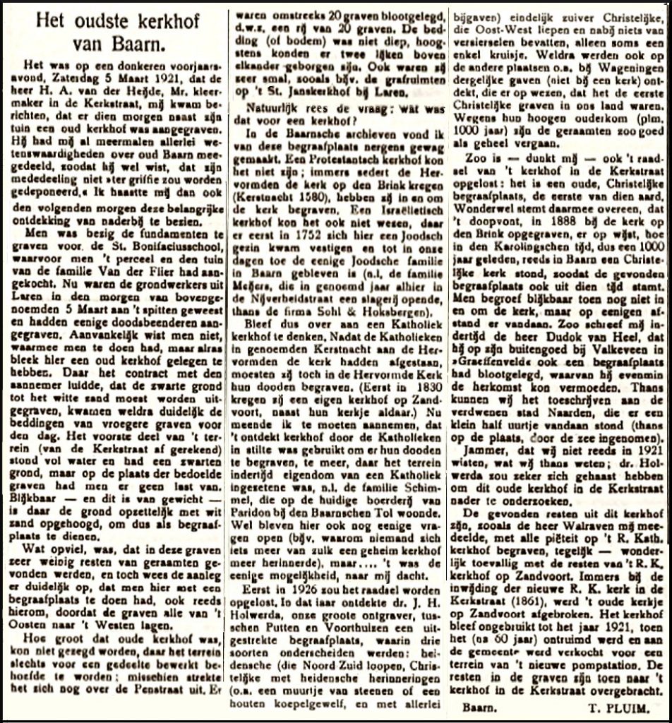 Het specifieke belang van de steen komt tot uiting in een krantenstukje uit De Eembode in 1928. Op 17 augustus schrijf de oude chroniqueur van Baarn, meester Teunis Pluim over het oudste kerkhof van Baarn.