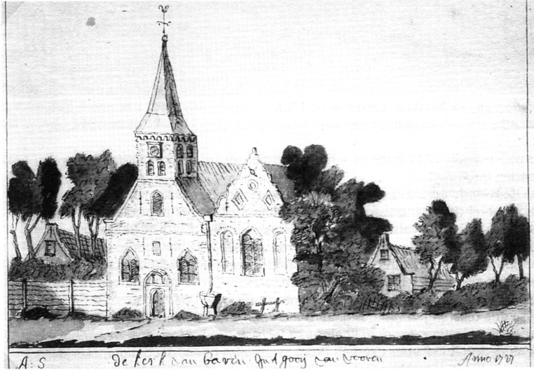 Over het tweede tekening zegt hij.” dat hier de ingang van de kerk was. Onder een regenpijp staat een stenen waterbak, misschien als drenkplaats voor de paarden. Zou het de doopvont kunnen zijn, die na de Reformatie van 1580 uit de kerk verwijderd werd ? De doopvont die later in twee stukken in de grond gevonden is?” De tekening heeft als onderschrift : de kerk van baren in ’t gooíj van vooren · Anno 1727