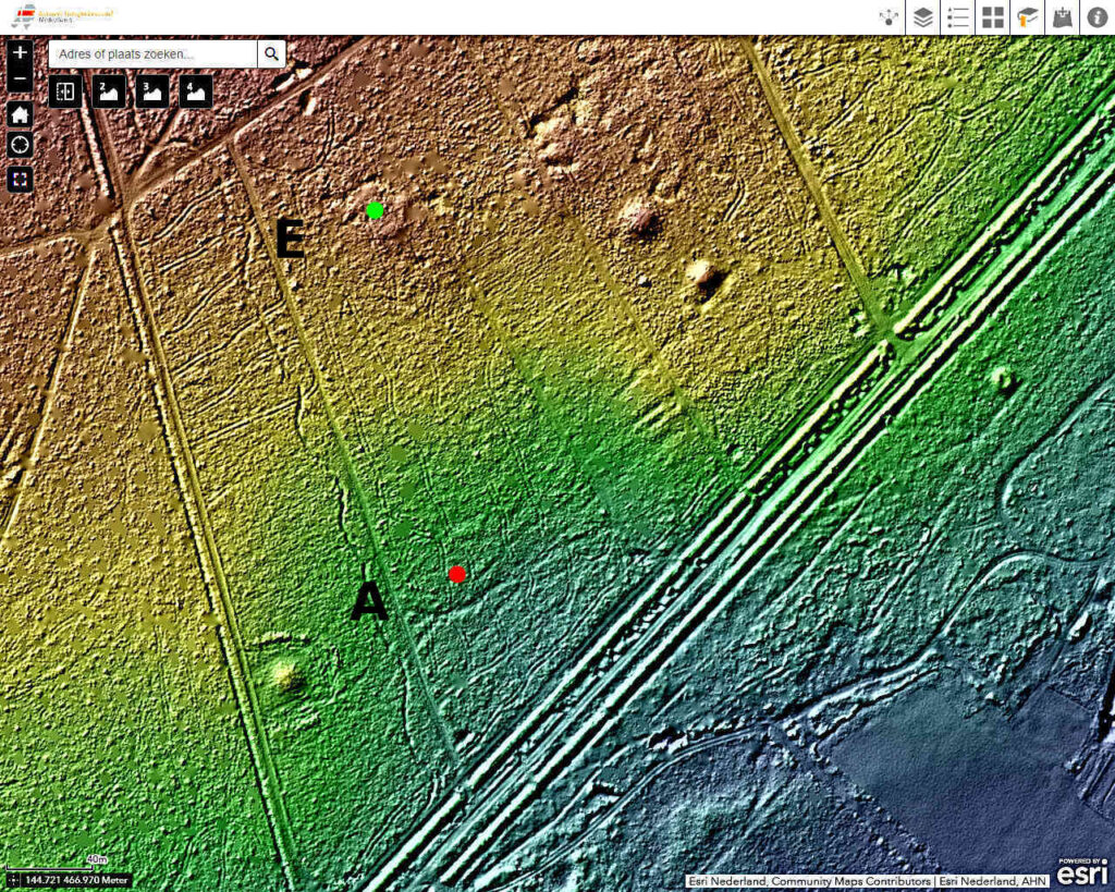 (C) is een amandelvormig stukje, niet ver van een grafheuvel. Op de AHN5 plaatje lijkt er zelfs iets van een cirkel. Het lijkt iets door menselijk ingrijpen ontstaan. Een theehuisje aan de oude weg zou kunnen. Ook hier de mogelijkheden als boven. Het lijkt net niks maar toch het opmerken waard.