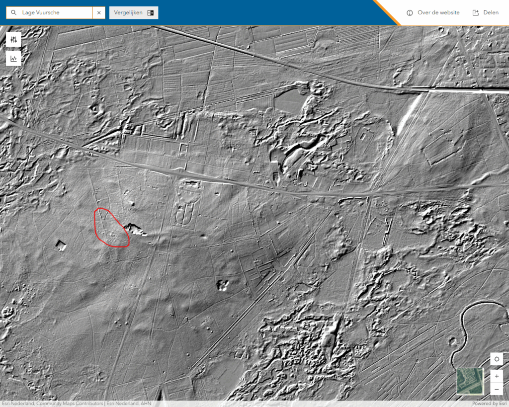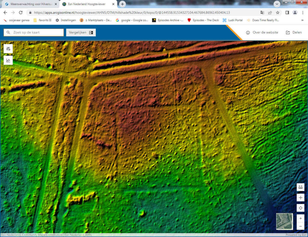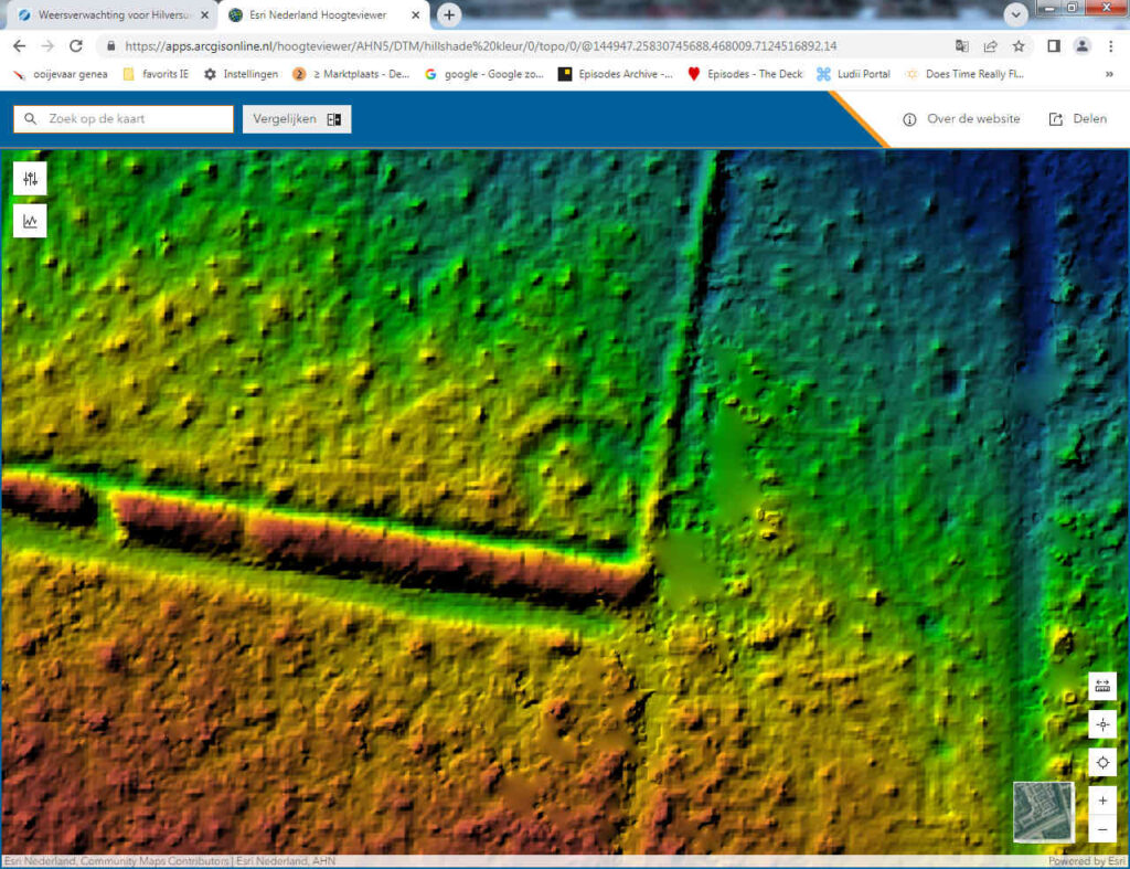 Als monument echter is zij onbeschermd. In de vorige eeuw heeft de ROB haar onderzocht en als grafheuvel afgeschreven. Zij is niet opgebouwd als grafheuvel (uit omgekeerde plaggen) en niet zo oud. Hoe oud dan wel? De heuvel heeft sinds begin 20ste eeuw onze aandacht. Dus toen stond die er al. Het kan een theehuisje hebben gehad als onderdeel van een ouder landgoed de Hoge Vuursche. Misschien hoorde het nog bij de hoeve de Zeven Linden. De mooiste hypothese is, denk ik dat we het mogen associëren met een op de hoogtekaart zo goed weergegeven omwalde terrein. Wij zien in dit terrein dus de vermaarde hof van Elten. In dat geval gaat alles meer dan duizend jaar terug, ook een respectabele leeftijd.
