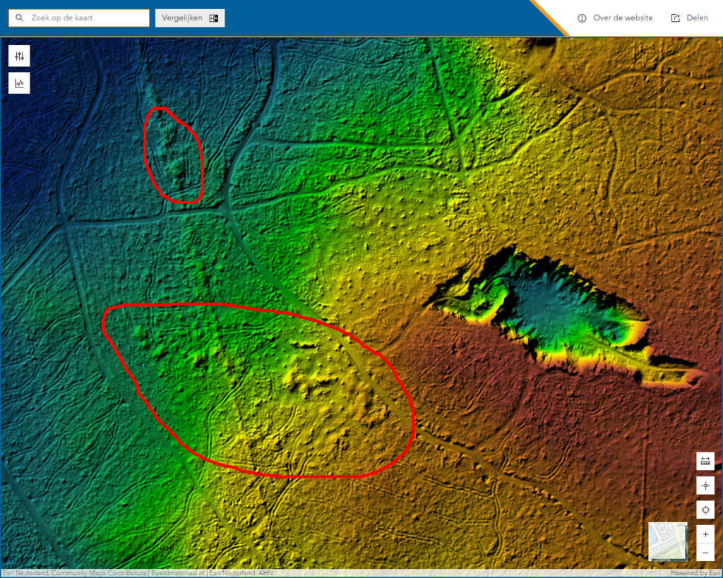 Oppervlakkig denk je misschien aan een urnenveld. De bultjes zijn echter iets te hoog, veel te onregelmatig en te gevarieerd. Als zij echter reeds in de 17de eeuw aanwezig waren, moeten zij toch een goed archeologische verhaal verhullen. Het lijkt misschien niet veel. Toch zie je dit verder in de omgeving niet. Dat maakt het vergelijkende wijs moeilijk de juiste context te duiden. Als u iets vergelijkbaars weet, wij horen het graag van u.