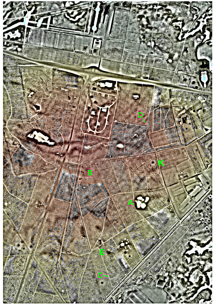 Keren wij nu terug naar de Vuursche eigenlijk. Om precies te zijn, het gebied tussen de Zevenlindenweg en de Hoge Vuurscheweg. U hoeft ze niet alfabetisch af te lopen. Eerst is daar een object dat al een naam heeft, waarover zelfs legendes worden verteld. De Koningszetel (K) zal hierom niet snel worden verstoord. Een bergje met greppels waartussen vier toegangen zijn gelaten, als vormden ze een Byzantijns kruis. Dat spreekt tot de verbeelding!
