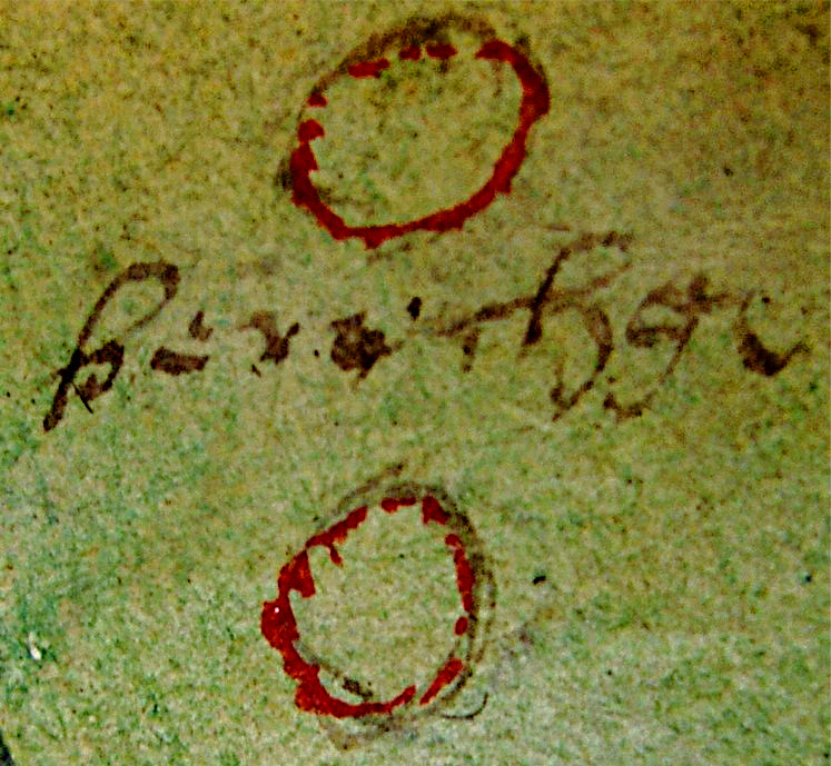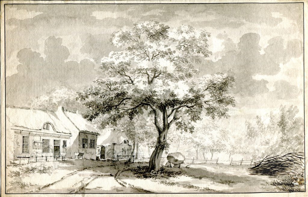 De op de foto nauwelijks zichtbare potloodcontouren van twee personen en een paard voor het rechthuis en een volle tweewielige kar met paarden voor de stal rechts is in de aquarel niet overgenomen. Bij vergelijking met de andere tekeningen blijken in A nogal wat zaken weggelaten te zijn. Ook klopt het perspectief niet helemaal. Boom en wolkenlucht zijn fraai in waterverf uitgewerkt. Qua schaduw zou de tekening op een zomermorgen gemaakt zijn. Het watermerk Franse Lelie komt ongeveer de hele achttiende eeuw voor. De tekenstijl duidt vooral op ca. 1780, hoewel hij nog wel tot 1820 voorkwam.4