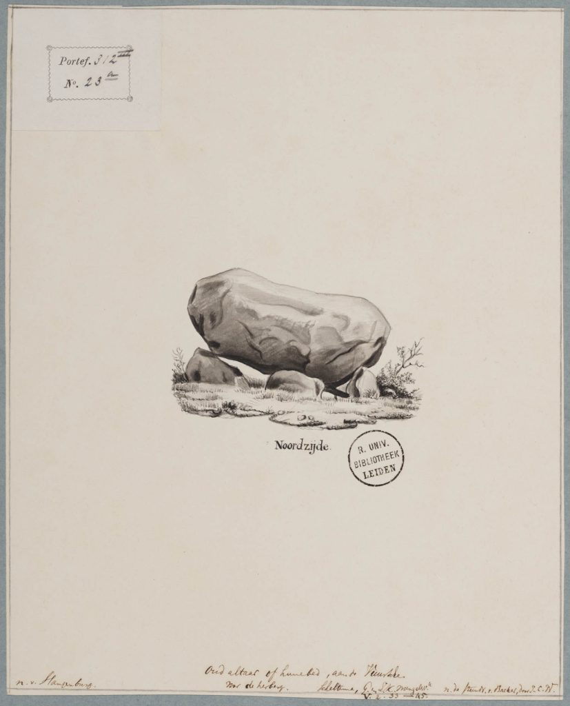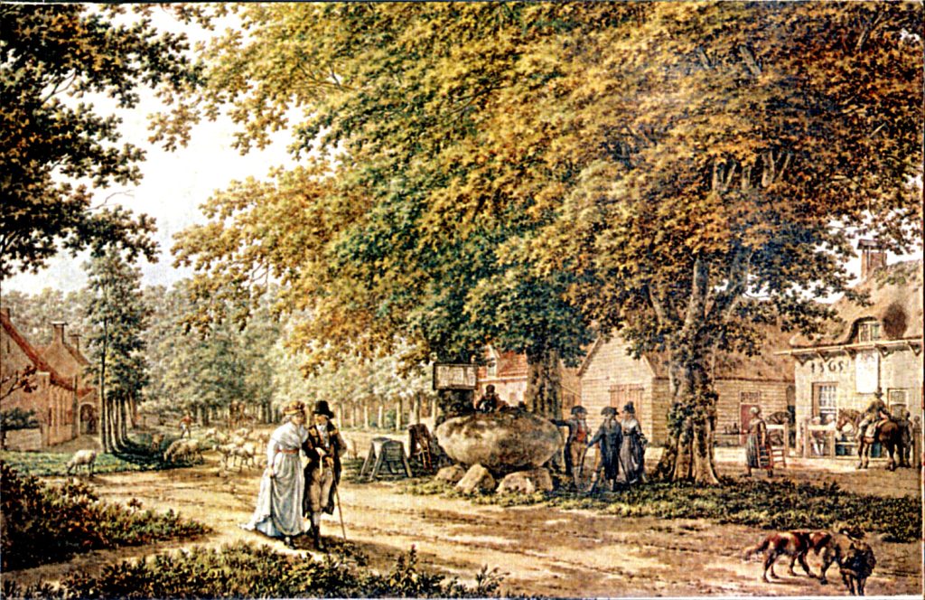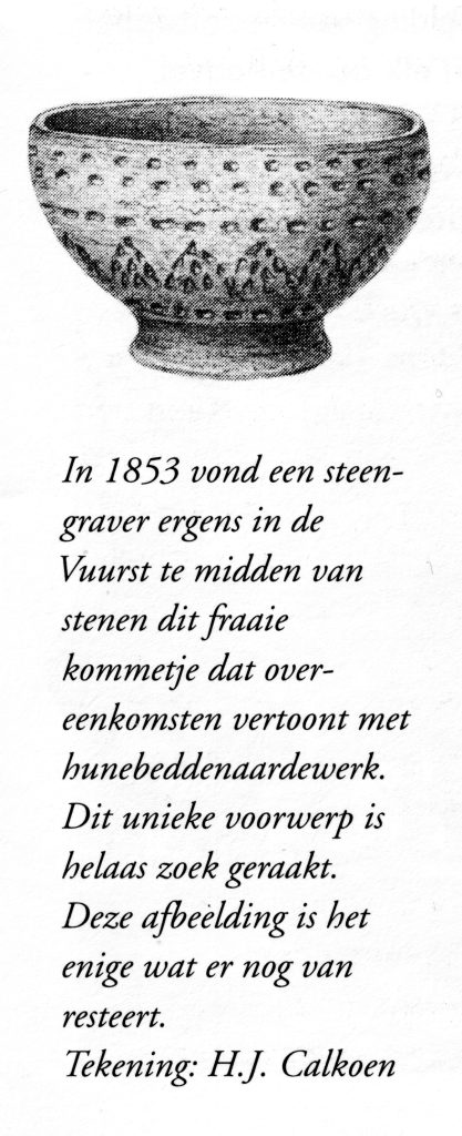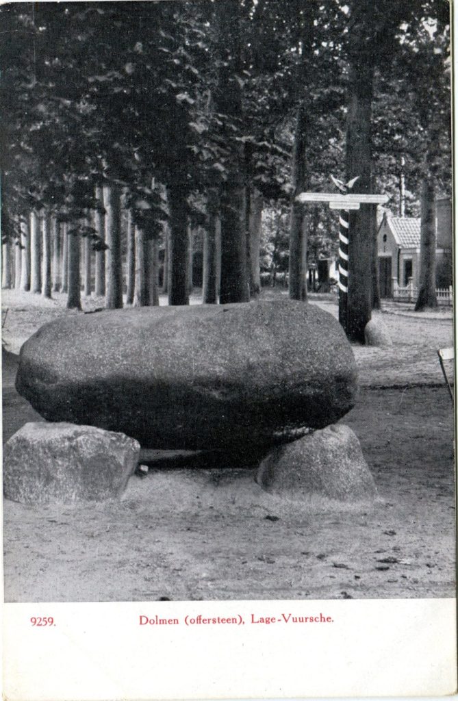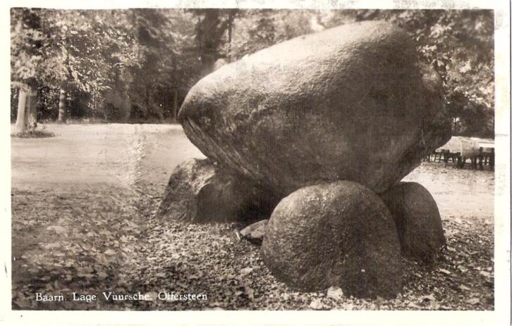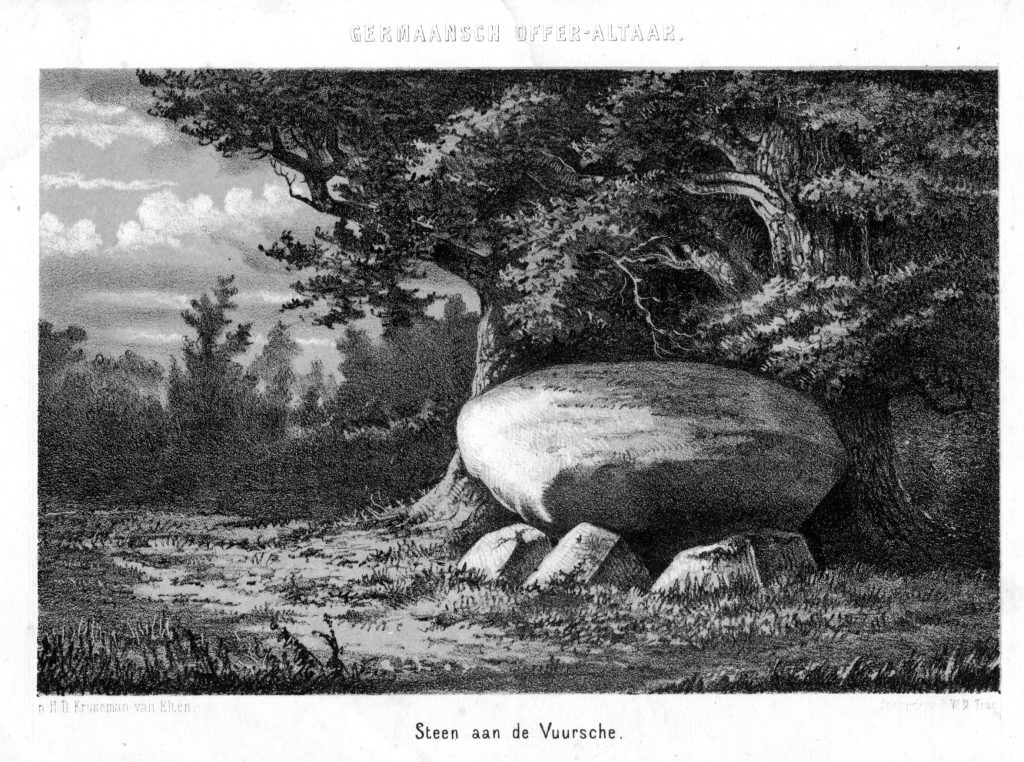 In de eerste studie over de Steen suggereerde J. Scheltema in 1833 dat deze ‘een oud altaar (dolmin) of een naar een hunebed zweemend overblijfsel van de eerste bewoners dezer landen‘ was.1 In 1846 leek de eerste gedachte bevestigd te worden door de publicatie van de vertaling van een brief uit de late negende eeuw, waarin een kloosterbroeder Harmarkerus beschrijft hoe hij de heidense bevolking bloederige offers op de Steen had zien brengen.2 Helaas was dit stuk een grapje van de latere rijksarchivaris L.P.C. van den Bergh, waar men nog steeds intrapt. Een van deze goedgelovigen was het Baarnse schoolhoofd T. Pluim, die zich ten slotte wel moest laten overtuigen van het bedrog, maar wel aan de altaarhypothese vast bleef houden. Ook die was niet juist, want onderzoek in het buitenland had inmiddels allang uitgewezen dat de dolmens, constructies van een of twee zware dekstenen rustend op kleinere draagstenen, geen altaren maar grafkelders van de Hunebedbouwers zijn geweest – in huidige termen van de Trechterbekercultuur (of TRB-cultuur), tussen ca. 3350 en 2700 v. C.. Terloops vermeld ik hier dat op de Goois-Utrechtse Heuvelrug op een groeiend aantal plaatsen TRB-aardewerk is gevonden, zodat de Hunebedbouwers er zeker gewoond hebben, zo ook te Lage Vuursche. Met enige moeite hadden zij vermoedelijk er ook wel de nodige grote zwerfstenen voor de bouw van een dolmen of een klein hunebed kunnen aanslepen.