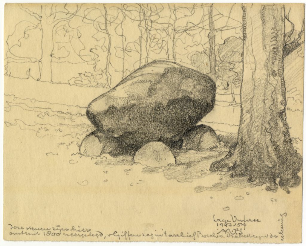 ‘De werklieden van Fuhrer hebben weder iets gevonden en half verstoord dat naar een haardstede gelijkt, ik hoop dat maandag te gaan opnemen en zal zeker berichten als er iets belangrijks gevonden wordt […]’ (9.9.1853). (Cahier 1957, 18). ‘Geachte Vriend […] Intusschen wil ik u niet doen wachten naar eenig bericht omdat het op uwe reisplannen van invloed zoude kunnen zijn. De Vuursche zal niets opleveren vermoede ik; met gespannen verwachting heb ik eene opgraving gedaan met Führer, maar dezelve lever- de weinig voldoenends. Wel eene bevloering en eenige kantlagen, sporen van asch, maar weinig, onvolkomen, laag, luttel gefatsoeneerd, eene soort of hoogstens twee soorten van steen, zijnde brokken van graniet en van brosse zandsteen. Noch in constructie, noch in vorm overeenkomende met de onder Hilversum gevonden haarden. Die bij deze vergeleken veel meer zorg en kunst vertoonden, geene voorwerpen van steen die bearbeid schenen, hoegenaamd; eene hoogst ruwe stookplaats misschien hooger van kanten geweest en verbroken gedeeltelijk, gelijk veel in die buurt; de plek is uitkomende uit het bosch van den weg van Maartensdijk naar de Vuursche, (de continuatie van den mooijen hoek die wij inreden naar Eik gaande) vijf minuten Zuidwestwaarts van den Vuurschen molen. Verder is tot hiertoe niets gevonden en ook de keijengraving voor den Laarder Straatweg [bij Hilversum) levert niets op. doet zich iets voor dan zal ik het melden.’ (30.9.1853). De bijgevoegde schets toont in perspectief een ring van veldkeien, van 1,63 bij 1,16 m, een situatieschetsje en de notitie: ‘De plek met heide begroeid[,] eene kleine verhooging van den grond{,] vroeger waarschijnlijk reeds afgegraven. nu de steenen nauwelijks een voet onder den grond[.] Sept. 1853.” (Cahier 1957, 19-20).