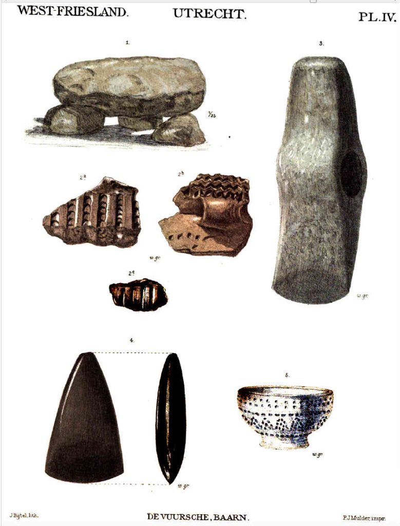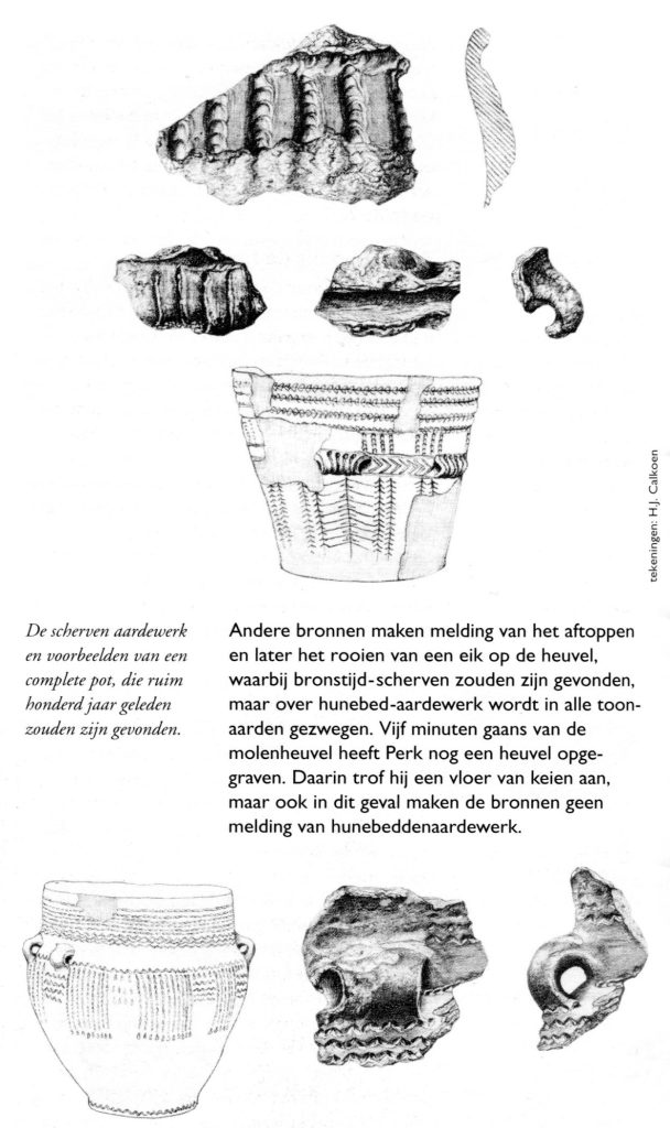 Pleytes overzichtswerk (1902-03, 74-75) stelde, conform de registratie van het RMO uit 1869, dat de afgebeelde scherven Vt 5-7 door ‘den Heer Perk’ waren geschonken en ‘gevonden bij het heuveltje aan den molen’. Pleyte schreef zich mede te baseren op een schetstekening van de opgraving in 1853 ‘in mijn bezit. Deze geeft eene steenbevloering met ovaal daaromheen liggende groote brokken steen, duidelijk het overblijfsel van een hunebed’. Twee brieven van Perk hierover, van 9.9.1853 en vooral 30.9.1853 (met de genoemde schetskaart) zijn geplakt in Pleytes convoluut ‘West-Friesland’, onder Baarn, Vuursche, vel 2 (archief RMO). Hier gaat het echter om een heel andere vindplaats: