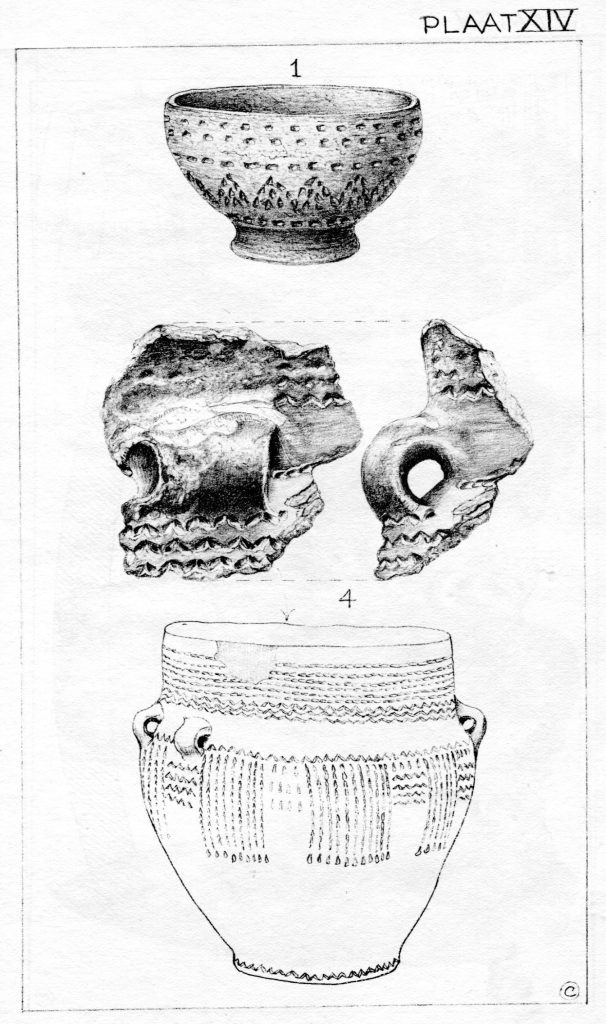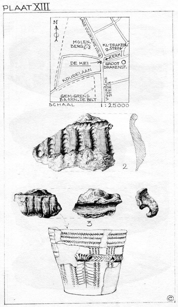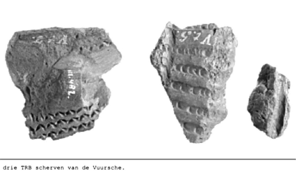 Drie TRB-scherven van Lage Vuursche (4, 55-57) zijn gelithografeerd door Pleyte (1902-1903, pl. TV, 2a-c) en opnieuw, naar de originelen, getekend door H.J. Calkoen (4, pl. XIII: 2-3, XIV: 4; repro in De Ridder 1997, 6). In het Rijksmuseum van Oudheden te Leiden (RMO) zijn ze geregistreerd onder de nummers Vt 5-7. Vt 1-7 waren ‘Germaansche Oudheden. Scherven van aardewerk aan de Vuurst en St. Maartensdijk gevonden. Van vroeger in het Museum in bewaring gegeven; doch eerst geïnventariseerd 23 Oct. 1869’ (RMO, inventarisboek 9.8.1869-1874, p. 53). Vt 1-4 waren scherven “uit Maartensdijk, uit de verzameling van den Heer Haasloop Werner.’ In 1957 noteerde ik: ‘hieronder 2 scherfjes van Drakesteinaardewerk, de andere ijzertijd.” Vt 5-7 waren volgens het inventarisboek ‘Afkomstig van den Heer Perk, gevonden bij het heuveltje aan den molen’ (Cahier 1957, 15). ‘Vt’ komt uiteraard van ‘“Vuurst’, alias De Vuursche.