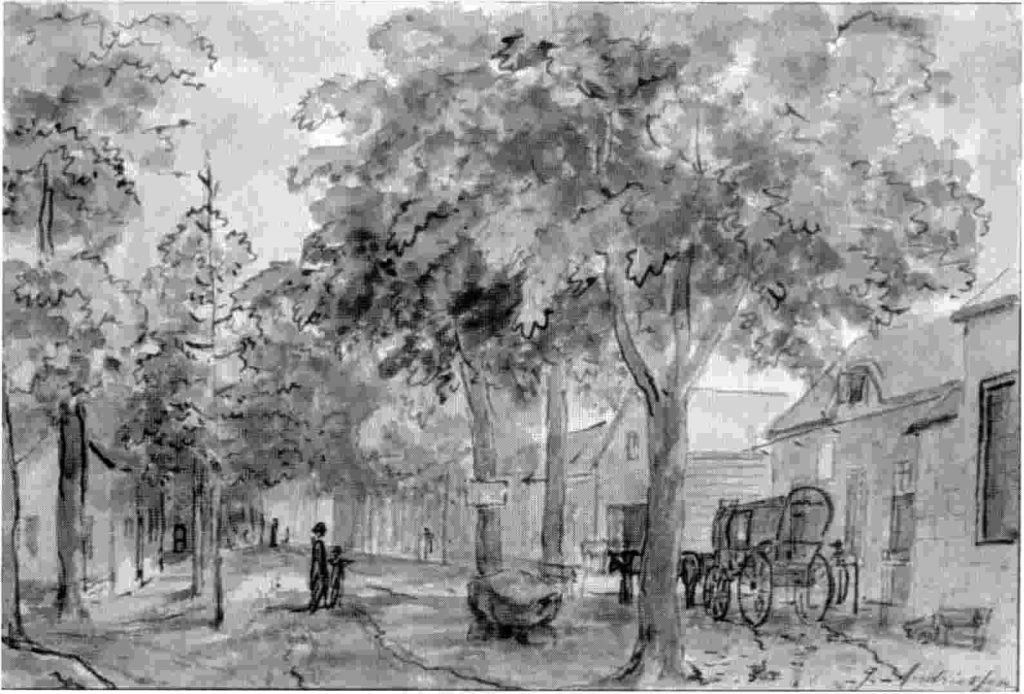 Op een lome zomermiddag speelt er een meisje met haar popen graast er een geitje. Vergeten is het rieten dak van de opkamer in te kleuren. Achterop een niet uitgewerkte aquarel van twee mannen in een poort aan het water en een botter op een winderige dag. De tekenstijl is die van Jan van Ravenswaay (1789-1869), van wie het Museum Hilversum een belangrijke collectie tekeningen en schilderijen bezit. De spontane uitroep (2001) van de heer G. Teeuwissen, medewerker van dat museum, ‘Dit is vast een Jan van Ravenswaay‘ zette mij op dit spoor. De tekening dateert vermoedelijk uit diens eerste Gooise periode, 1804-1838, en niet uit zijn tweede, 1855-1869. Vergelijk bijvoorbeeld de onkruidjes op de voorgrond en de bolling van kleren op zijn gewassen tekening van kijkers naar de zonsverduistering van 1820 bij de Hilversumse molen.7 Misschien had degene die achterop E Lage Vuursche ± 1820 schreef precies diezelfde tekening op het oog. Olievlekken tonen dat de tekening in een schildersatelier gebruikt is. Zo kan er dus nog ergens een schilderij van dit gezicht bestaan!