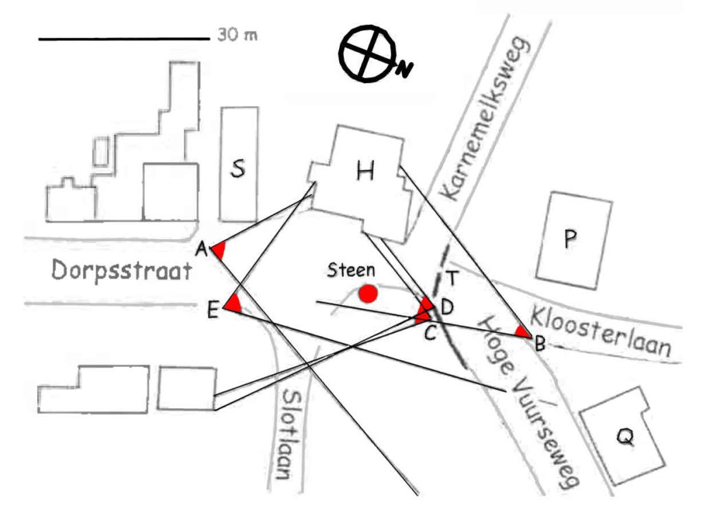 Naar het voorbeeld van Erik Schmitz 12 plotte ik op een vergroting van de kadaster-kaart van 1824 de vijf gezichtspunten van de tekeningen A – E (afb. 6). Zij werden afgeleid uit de positie van de gebouwen en de Steent en opzichte van elkaar. Plaats en dimensies van de gebouwen bleken redelijk nauwkeurig, afgezien van de in tekening A vergeten aanbouw. Nergens waren objecten samengeschoven, zoals op Italiaanse veduten. De plaats van tolhek en tolboom, die niet op kaarten is aangegeven, blijkt uit A en B,ook zijn C en D ziende van het tolhek getekend. Op B is de aan het eind verzwaarde tolboom prominent weergegeven, op A is hij nog net links en rechts achter de lindeboom zichtbaar. Volgens B was naast de tolboom een (te?) ruime doorgangsruimte voor voetgangers en ruiters, en in B en vooral in A belette een lang tolhek daarnaast het rijverkeer illegale doorgang. Dit hek liep langs de zuidrand van de Hoge Vuurseweg en één geleding stond langsde noordrand van de Karnemelksweg.