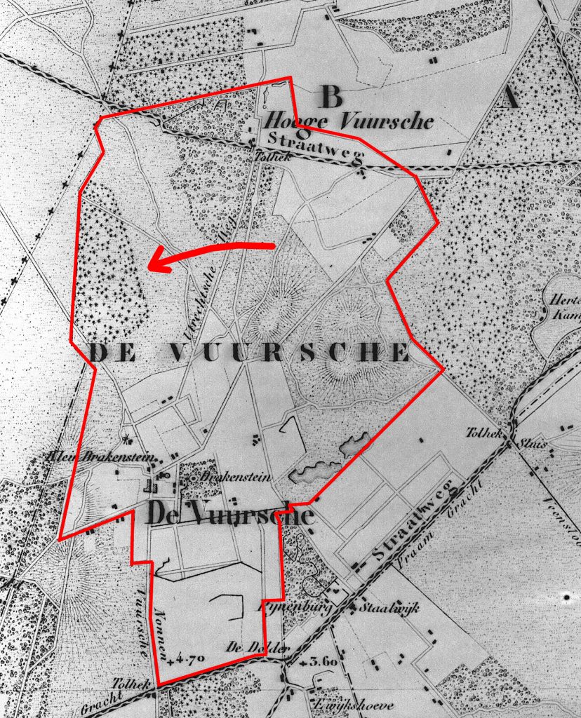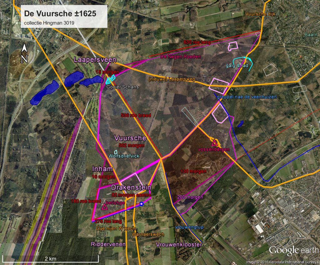 Hierbij komt het grote centrale gedeelte van de Vuursche nogal bekaaid er vanaf. We weten door de 1625 kaart wel hoe ver de oude Laapersweg van de Zes Wegen in het zuiden tot de inschinkeling in het noorden loopt. Veel meer informatie geven de kaarten echter niet en derhalve valt er niet meer in het kader van ons onderzoek erover mede te delen.