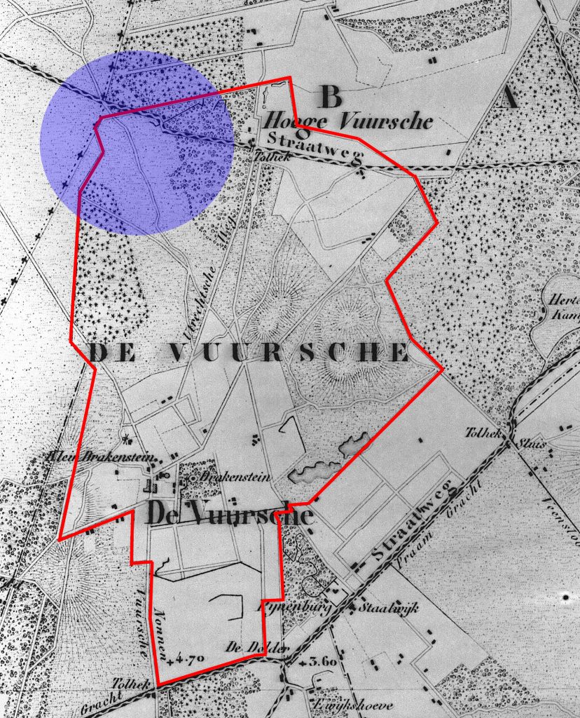 Aan de westzijde lijkt het een dubbele stippellijn te hebben en een stukje extra streep. Op zich lijkt zo’n detail te weinig om van betekenis te zijn. Als we deze hoeve op de kaart terugzoeken, blijkt deze te liggen dwars over de huidige grote weg, de Hilversumsestraatweg, direct ten westen van de oude Vuursche Dijk. En dat blijkt uiteraard niet toevallig zo. De achterkant van deze hoeve komt precies overeen met de beroemde grote beuk aan de Hoge Vuursche en met de oude grens tussen Holland en het Sticht.