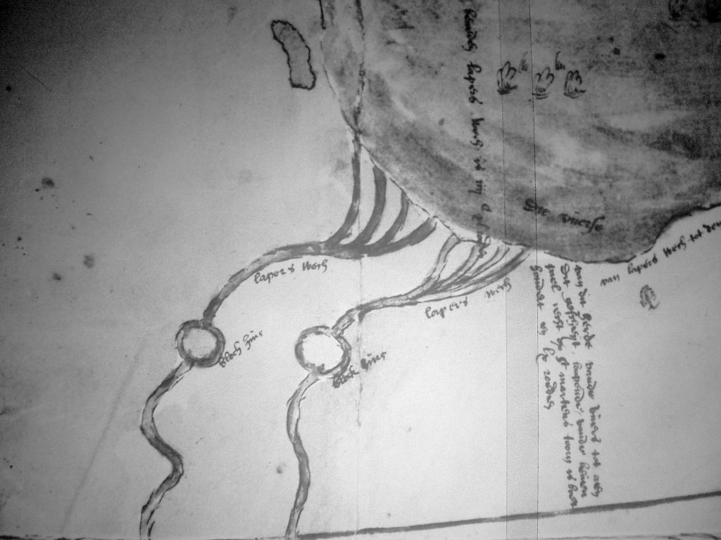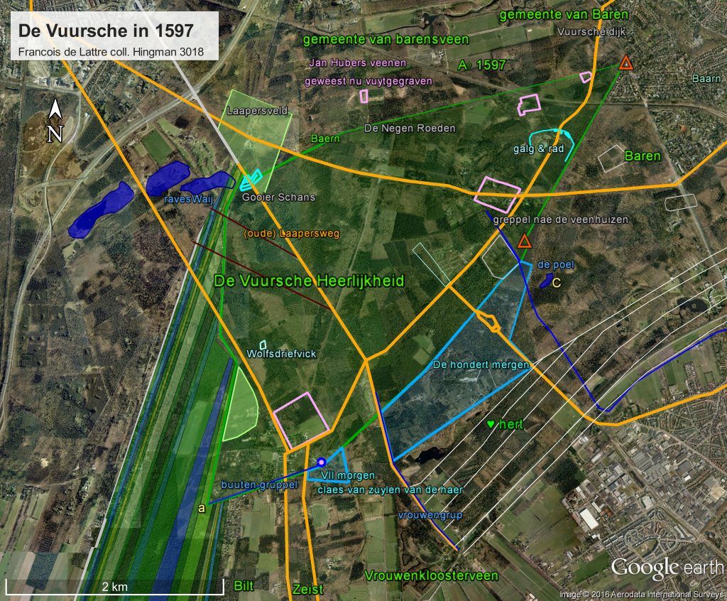 Nu is dit op zichzelf geen bewijs. Andere zaken op de kaart blijken vaak slechts in de buurt getekend te zijn van waar we ze in werkelijkheid kunnen terugvinden. Wel moet geconstateerd worden dat wanneer de maker op de Vuursche verkeerde, hij die greppel en grachten iedere dag zag. We weten dat de derde gracht in 1569 is gegraven. Vóór die tijd was de zuidgrens geraaid op de buitenste gracht van Wernaars Hofstee.
