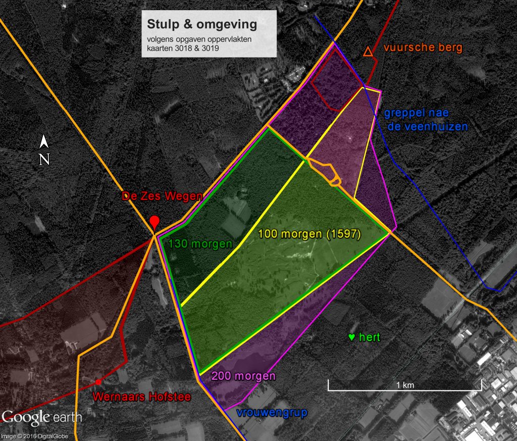 200 en 130 morgen zijn vermeld omdat de ±1625 kaart sowieso alles opmeet maar ook omdat je een gebied van 130 of zelfs 200 morgen niet de Hondert Mergen kon noemen. Ze duiden dan ook respectievelijk andere oppervlakten aan.