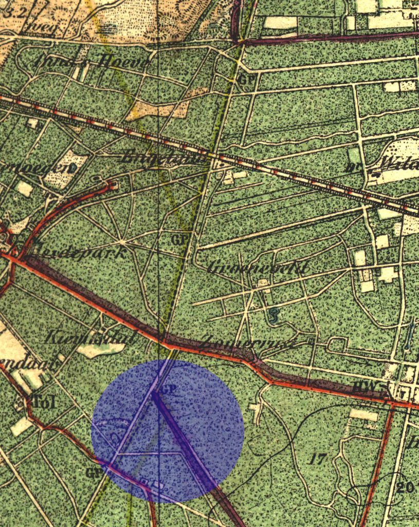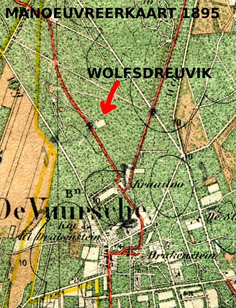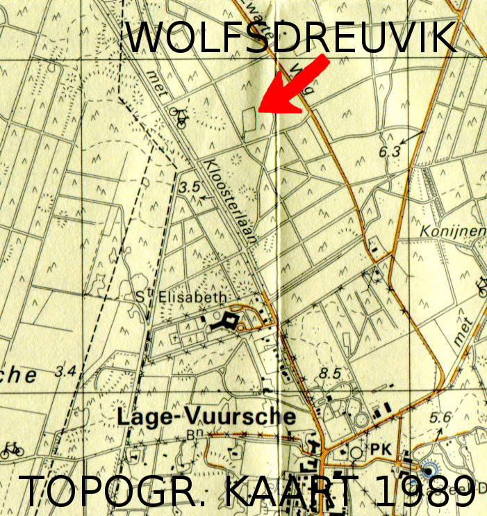 Er is één terrein dat in aanmerking komt hiervoor, een klein merkwaardig terrein iets ten oosten van de Kloosterlaan. Aanvullend bewijs hiervoor is te vinden op kaart 2584 van de collectie Hingman. Daarop zijn annotaties aangebracht door landmeter Sibrandt Hansz. Hoewel de Wolfsdreuvik zelf niet op de kaart voorkomt, zijn wel twee afstanden genoteerd. Van de Wolfsdreuvik tot het Gooiers Bos is de afstand 460 roede, hetgeen klopt. Tot de Laapersweg bedraagt de afstand 400 roede. Dit moet de oude Laapersweg zijn, je komt dan uit op die kaart bij de plaats van het kruis, op de 1597 kaart boven de inschinkeling, op het noordelijkst van de heerlijkheid.