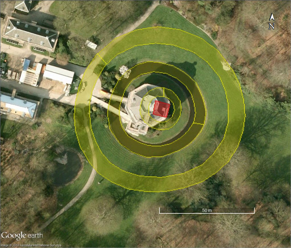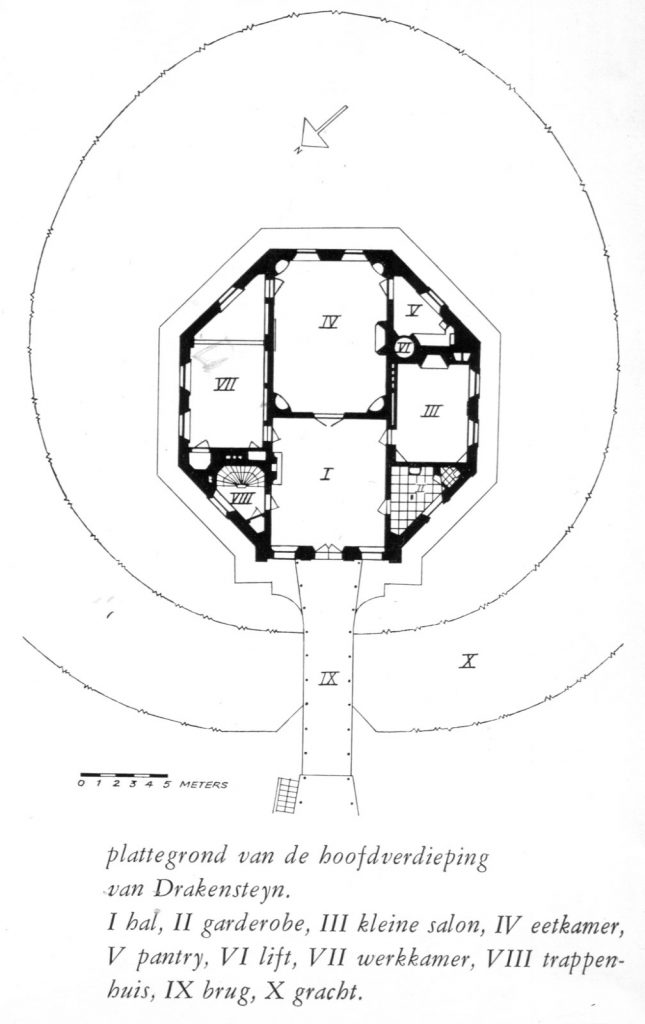 Beschouwen we Drakensteyn vanuit de lucht. In elk geval valt ten eerste op dat de gracht rond het eilandje niet erg strak is gegraven. Het doet eerder middeleeuws aan dan gouden-eeuws. Maar hierbij valt de excentrische ligging van het huis op het eilandje op.