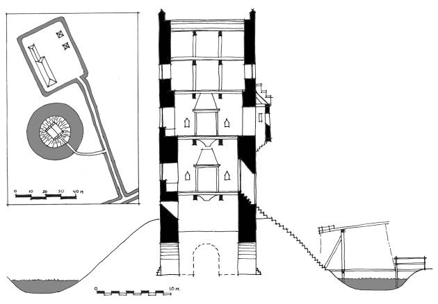 Ik vermoed dat het volgende is gebeurd. De tegen de toren opgeworpen grond is terug gestort in de binnenste ringgracht (of als veen alsnog opgestookt waarbij er zand uit de buurt gehaald moet zijn om de gracht te vullen). De toren, die midden op het kleine eiland had gestaan is rond 1640 uit praktisch motief hierna geïncorporeerd aan de achterzijde van het nieuwe huis. Of en hoeveel van de oude toren in de resterende muurwerk is gebruikt, weet ik niet. De vloerplan van souterrain, begane grond en verdieping kunnen een aanwijzing kunnen geven.