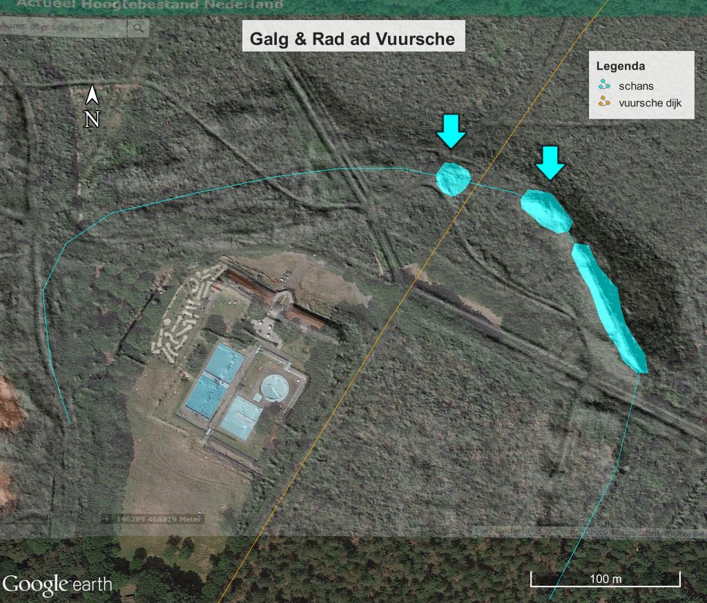 Verderop bevinden zich echter nog een paar bergjes die het beste voldoen aan de omschrijvingen en verwachtingen. Aan het einde van de Bosbadlaan, achter de parkeerplaats bevinden zich enkele merkwaardige bergjes waar mijns inziens de galg & rad op de Vuursche gezocht moeten worden. Komend vanuit Eembrugge vormden ze zo een duidelijk vignet van de hoge rechtsmacht van heerlijkheid hier. De westelijke berg is minder geprononceerd dan de oostelijke berg maar zoals de oude weg hier voorbij ging nog altijd meer dan manshoog. Misschien was de westelijke berg de galg en de oostelijke de rad, de kaarten zijn echter niet helemaal duidelijk wat dit betreft.
