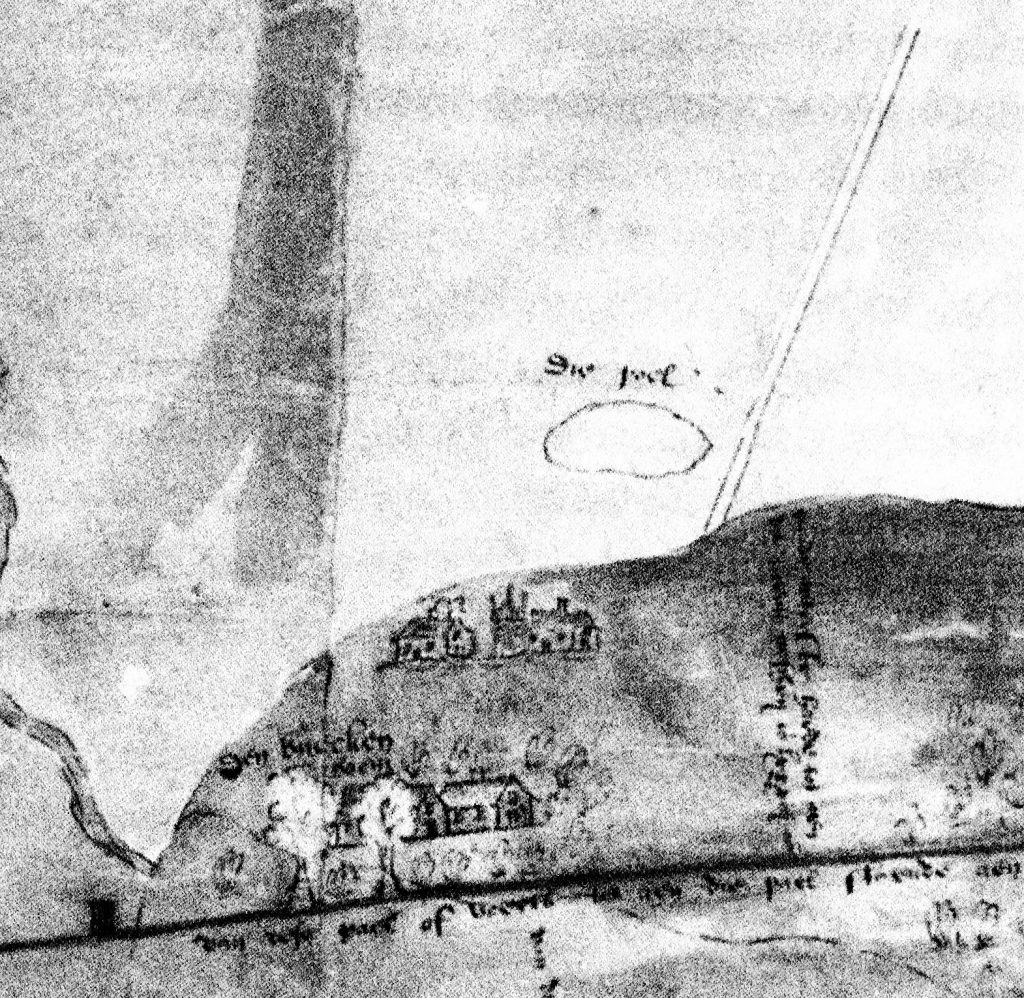 De Lattre heeft hier de Poel tegen de Hondert Mergen aan getekend. Hierin heeft hij een C geschreven, indien dit niet gewoon voor een kras moet worden gezien. Hierbij heeft hij nog net leesbaar geschreven poel.